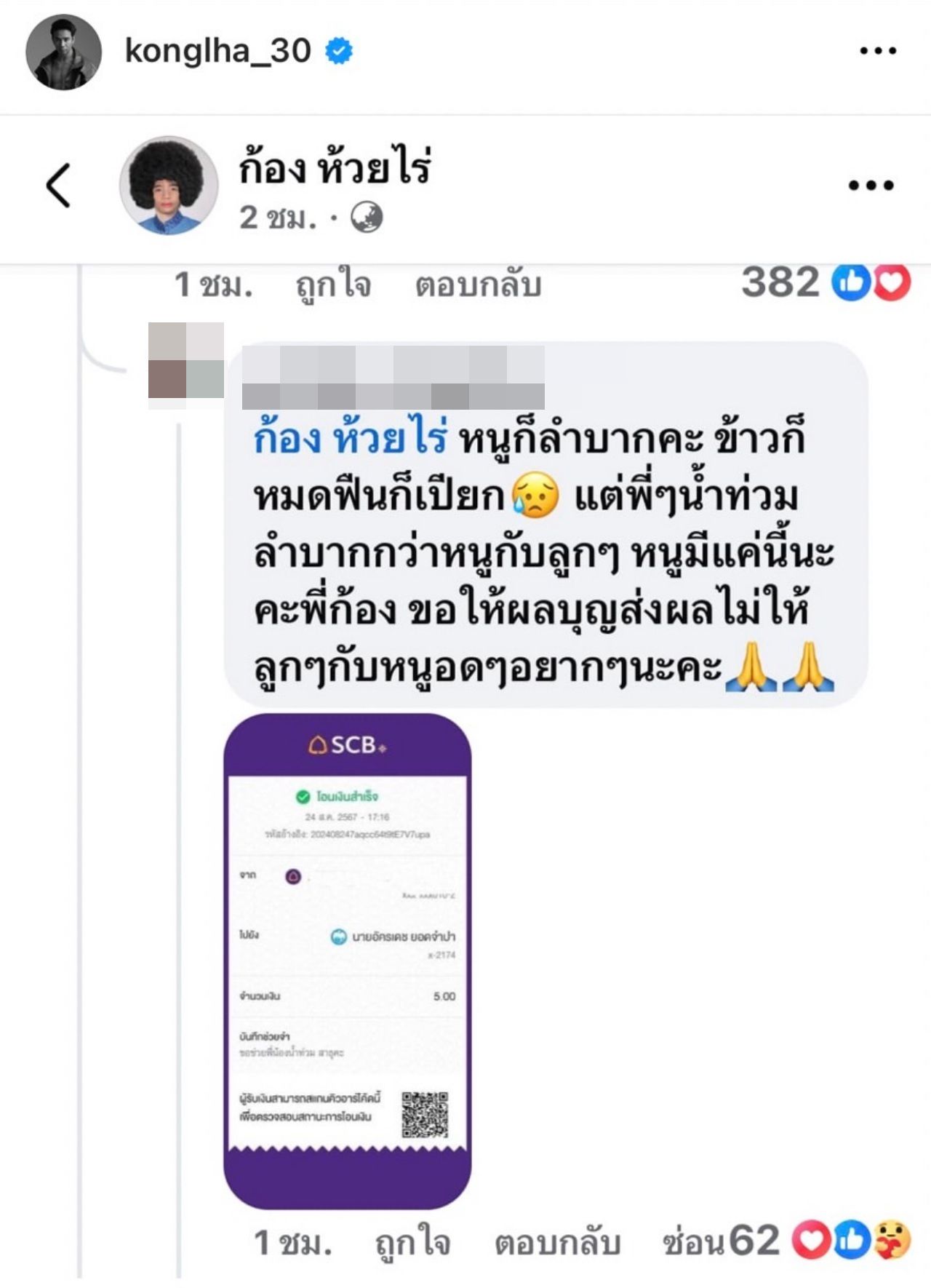 และล่าสุด ก้อง ก็ได้โพสต์ภาพข้อความที่มีผู้หญิงคนหนึ่งเข้ามาคอมเมนต์ร่วมบริจาคช่วยเหลือน้ำท่วมกับ ก้อง ห้วยไร่ เป็นเงินจำนวน 5 บาท พร้อมเขียนระบุว่า