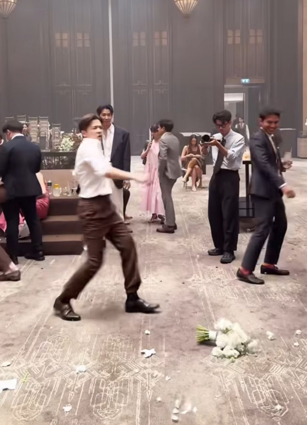 แต่ครั้งนี้ เพื่อนแต่ละคนพากันวิ่งหนี ทั้งเตะช่อดอกไม้กันอย่างสนุกสนาน โดยเฉพาะ มาร์ช ที่ดูจะสนุกมากกว่าใคร จน หมอเยลลี่ แฟนสาวต้องมาดึงตัวออกไป และ มาร์ช ก็ได้เขียนแคปชั่นว่า "เมื่อเจ้าบ่าวโยนช่อดอกไม้ให้เพื่อนๆ เวลาของผมก็มาถึง คำเตือน: เมื่อคุณสนุกในปาร์ตี้เกิน อย่าท้าทายกับระบบ"