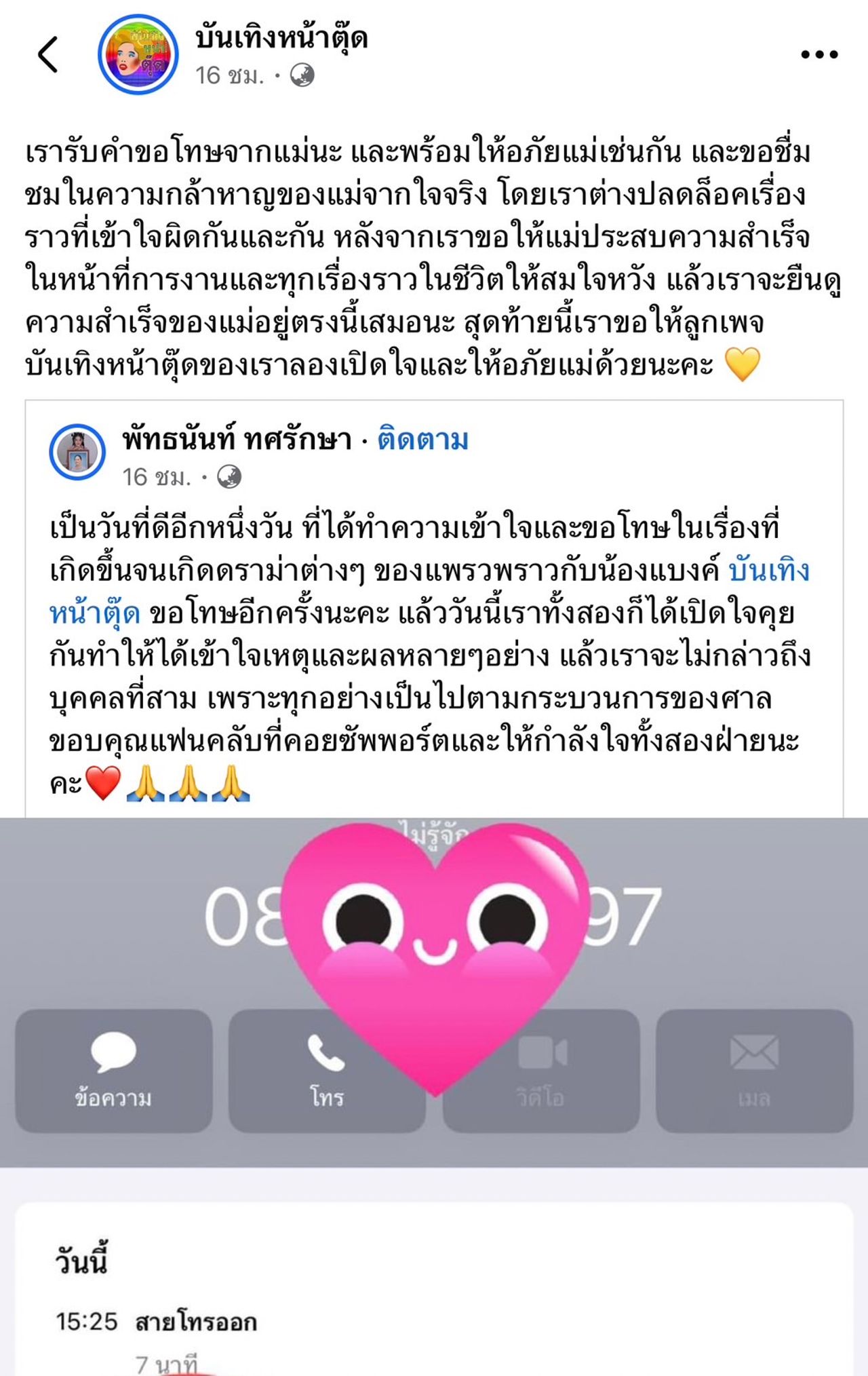 หลังจากนี้ เราขอให้แม่ประสบความสำเร็จในหน้าที่การงานและทุกเรื่องราวในชีวิตให้สมใจหวัง แล้วเราจะยืนดูความสำเร็จของแม่อยู่ตรงนี้เสมอนะ สุดท้ายนี้เราขอให้ลูกเพจบันเทิงหน้าตุ๊ดของเราลองเปิดใจและให้อภัยแม่ด้วยนะคะ"