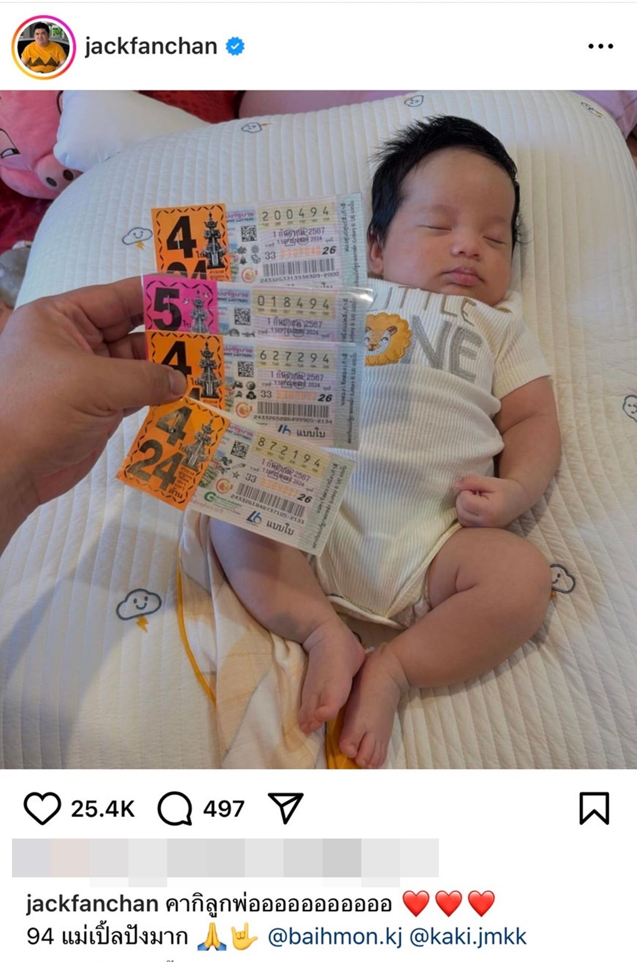 รวมไปถึง พ่อแจ็ค ด้วยกันเช่นกัน และหลังจากที่ผลรางวัลสลากกินแบ่งรัฐบาลออก แจ็ค ก็ได้โพสต์รูปลอตเตอรี่รางวัลเลขท้าย 94 ทั้งหมด 17 ใบ พร้อมกับเขียนแคปชั่นว่า "คากิลูกพ่อออออออออออ 94 แม่เปิ้ลปังมาก"