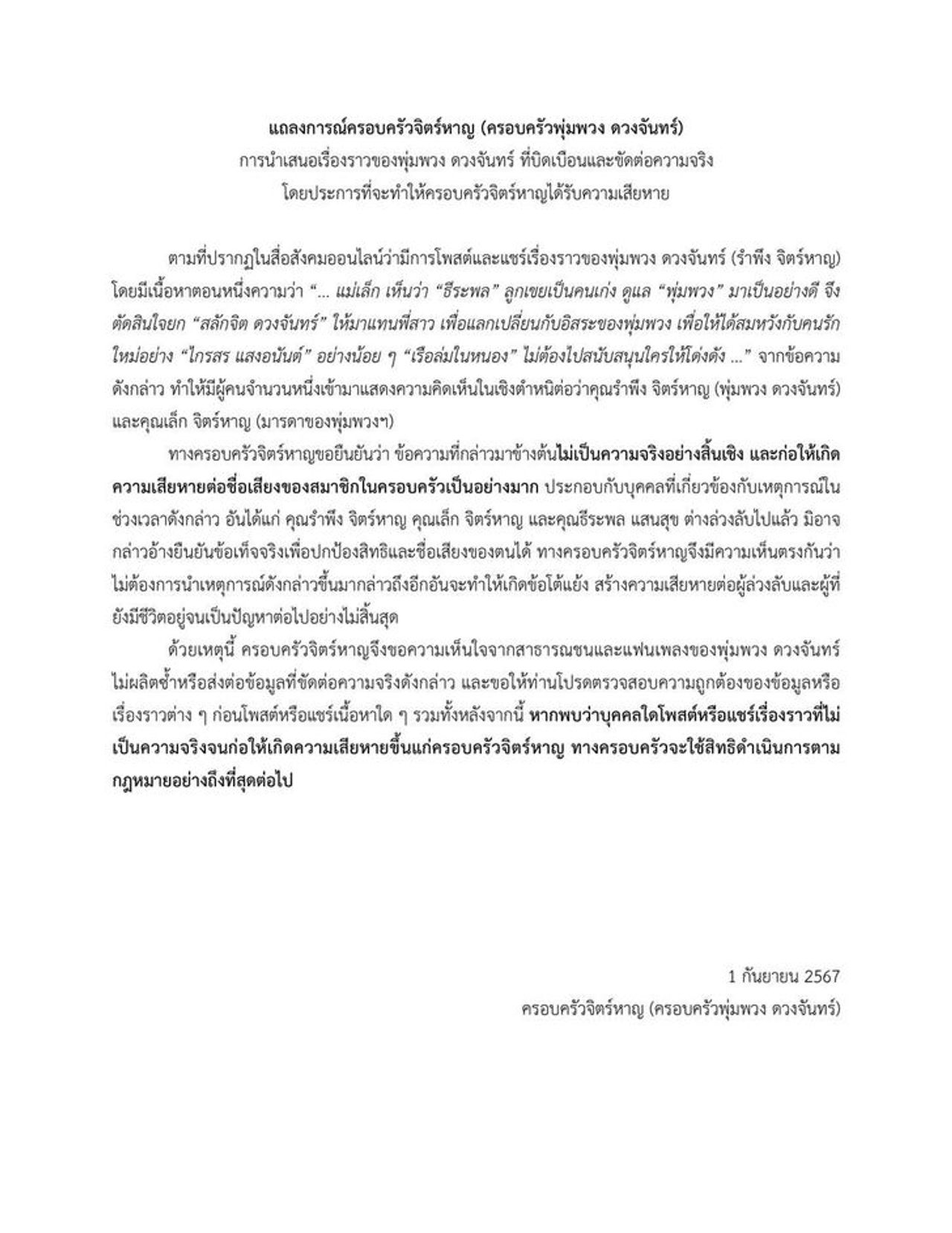จากเรื่องนี้ทำให้ครอบครัวจิตร์หาญ ซึ่งเป็นครอบครัวของพุ่มพวง ดวงจันทร์ โพสต์จดหมายชี้แจงประเด็นนี้ว่าไม่ใช่เรื่องจริง และบุคคลที่ถูกพูดถึงต่างก็ล่วงลับไปแล้ว ไม่อาจออกมาชี้แจงเพื่อปกป้องชื่อเสียงได้ อีกทั้งยืนยันว่าหากยังมีการโพสต์หรือแชร์เรื่องราวที่ไม่เป็นความจริงจนทำให้เกิดความเสียหาย จะดำเนินคดีตามกฎหมายจนถึงที่สุด