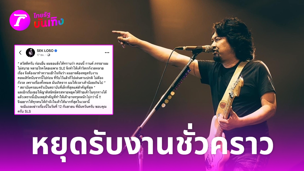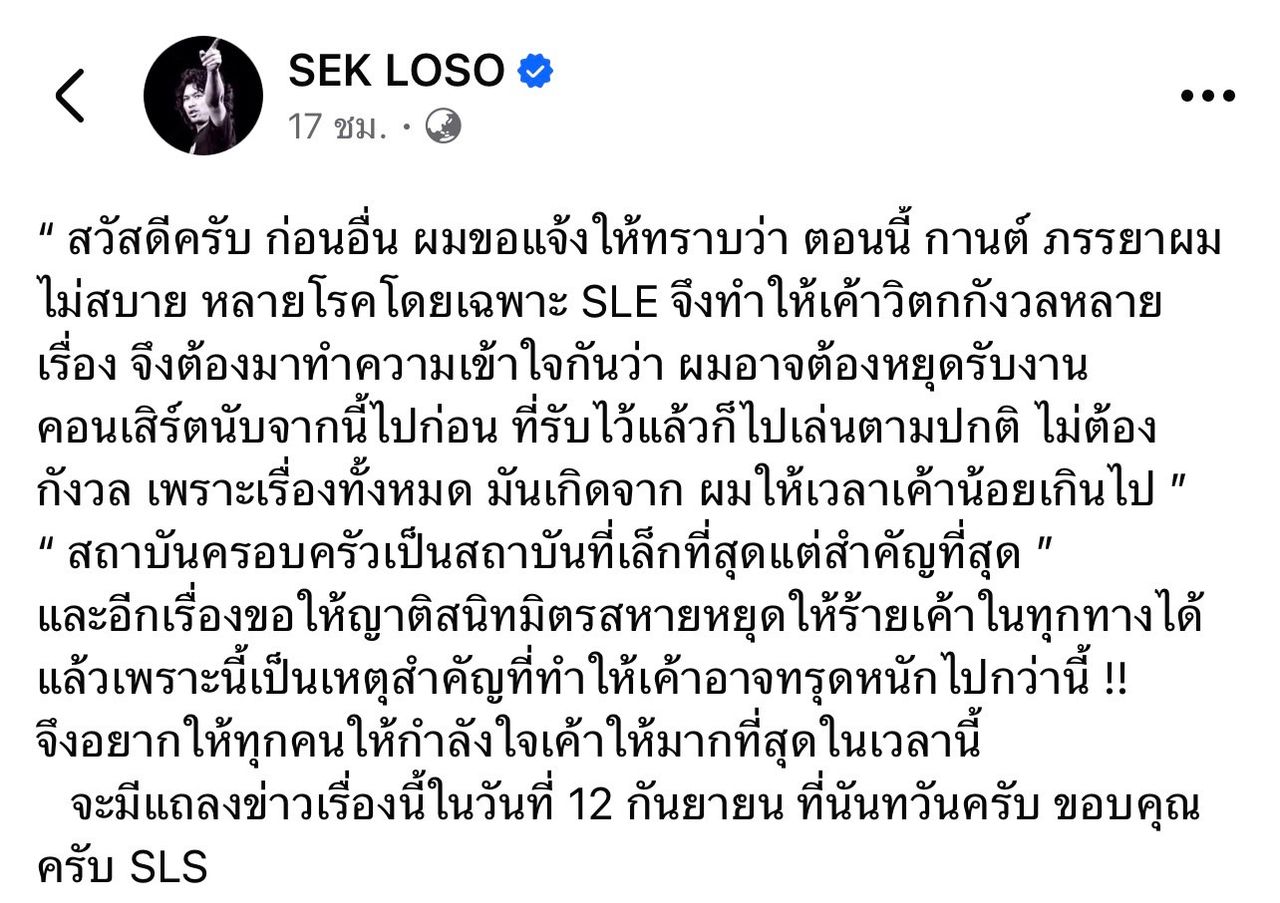 ยิ่งช่วงนี้ทราบว่าภรรยากำลังป่วยต่อสู้กับโรค SLE หรือโรคพุ่มพวง นั่นทำให้ล่าสุด เสก โลโซ ออกมาประกาศหยุดรับงานคอนเสิร์ตชั่วคราว ผ่านเฟซบุ๊กส่วนตัว