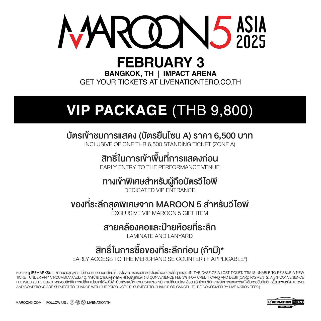 แฟนๆ ชาวไทยห้ามพลาด กับคอนเสิร์ตสุดมันส์ของศิลปินขวัญใจชาวมิลเลนเนียม ‘Maroon 5 Asia 2025 - Bangkok’ (มารูนไฟฟ์ เอเชีย 2025 – แบงค็อก) เอกสิทธิ์สำหรับผู้ถือบัตรมาสเตอร์การ์ดในประเทศไทย รับสิทธิ์ซื้อบัตรเข้าชมการแสดงก่อนใคร ตั้งแต่วันพุธที่ 18 กันยายน (10.00 น.) ถึงวันศุกร์ที่ 20 กันยายน (10.00 น.) และรับสิทธิ์ซื้อบัตรคอนเสิร์ตโซนพิเศษด้วยบัตรมาสเตอร์การ์ด