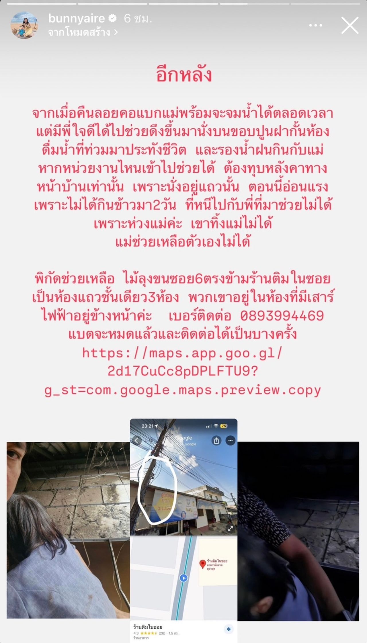 และอีกโพสต์ระบุว่า "อีกหลังจากเมื่อคืนลอยคอแบกแม่พร้อมจะจมน้ำได้ตลอดเวลา แต่มีพี่ใจดีได้ไปช่วยดึงขึ้นมานั่งบนขอบปูนฝ่ากั้นห้อง ดื่มน้ำที่ท่วมมาประทังชีวิต และรองน้ำฝนกินกับแม่ หากหน่วยงานไหนเข้าไปช่วยได้ ต้องทุบหลังคาทางหน้าบ้านเท่านั้น เพราะนั่งอยู่แถวนั้น ตอนนี้อ่อนแรงเพราะไม่ได้กินข้าวมา 2 วัน ที่หนีไปกับพี่ที่มาช่วยไม่ได้เพราะห่วงแม่ค่ะ เขาทิ้งแม่ไม่ได้แม่ช่วยเหลือตัวเองไม่ได้ พิกัดช่วยเหลือ ไม้ลุงขนซอย 6 ตรงข้ามร้านติมในซอย เป็นห้องแถวชั้นเดียว 3 ห้อง พวกเขาอยู่ในห้องที่มีเสาไฟฟ้าอยู่ข้างหน้าค่ะ เบอร์ติดต่อ 089-399-94469 แบตจะหมดแล้วและติดต่อได้เป็นบางครั้ง"