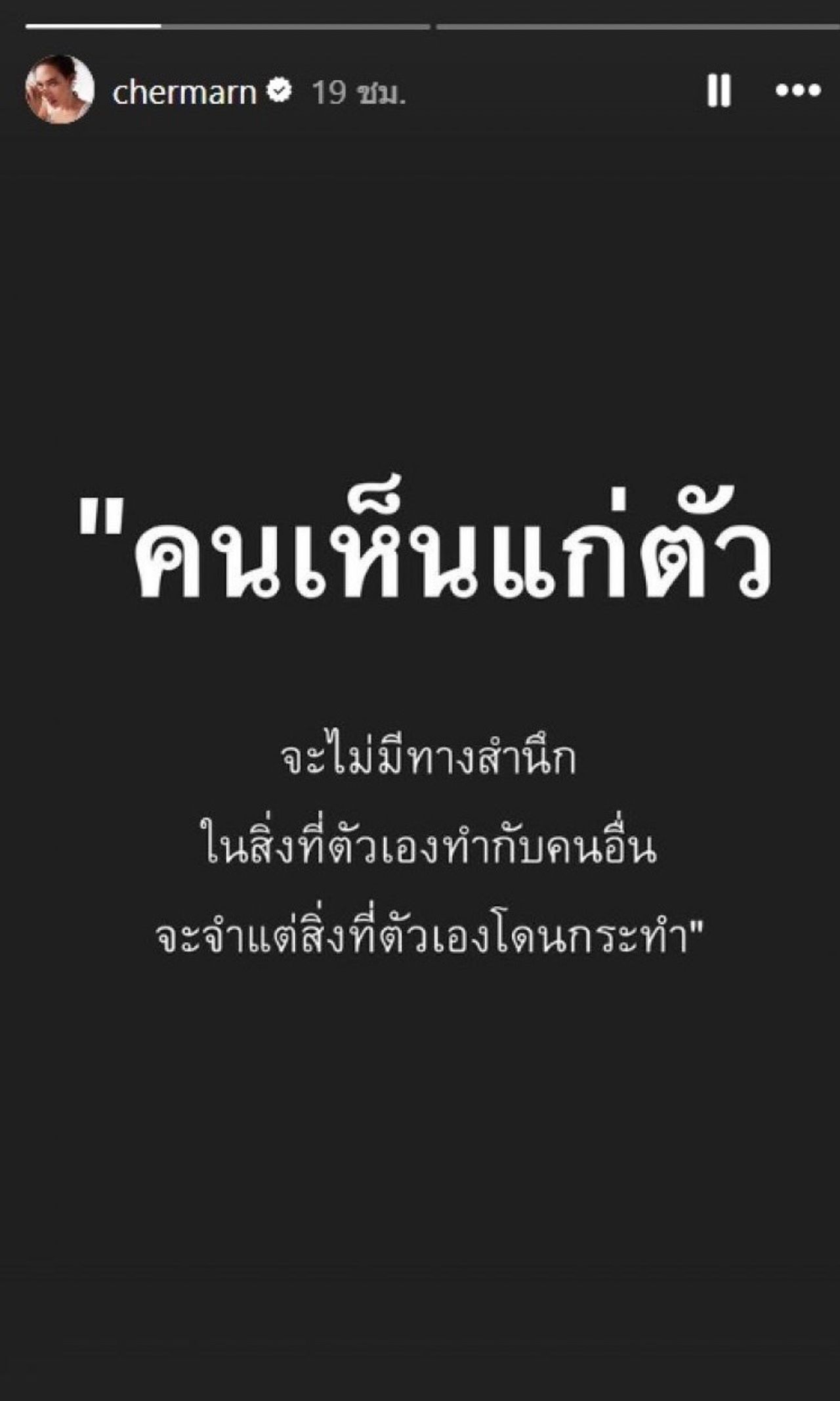 โดยในไอจีสตอรี่ล่าสุด สาวพลอย ออกมาโพสต์ข้อความระบุว่า "คนเห็นแก่ตัว จะไม่มีทางสำนึก ในสิ่งที่ตัวเองทำกับคนอื่น จะจำแต่สิ่งที่ตัวเองโดนกระทำ"