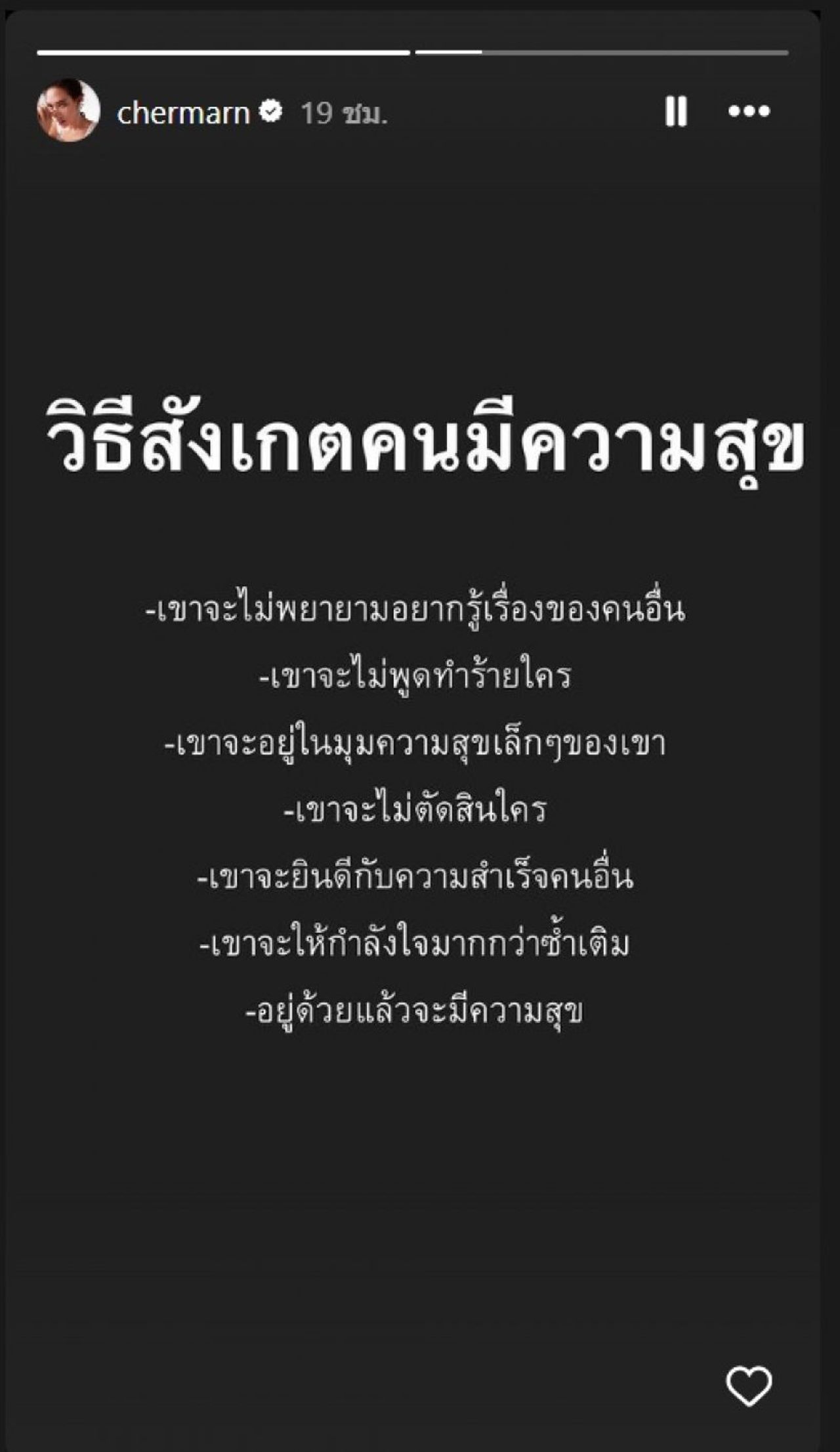ยังไม่หมดเพียงเท่านี้ เพราะอีกโพสต์ได้ระบุข้อความที่ว่า "วิธีสังเกตคนมีความสุข เขาจะไม่พยายามอยากรู้เรื่องคนอื่น เขาจะไม่พยายามพูดทำร้ายใคร เขาจะอยู่ในมุมความสุขเล็กๆ ของเขา เขาจะไม่ตัดสินใคร เขาจะยินดีกับความสำเร็จคนอื่น เขาจะให้กำลังใจมากกว่าซ้ำเติม อยู่ด้วยแล้วจะมีความสุข"