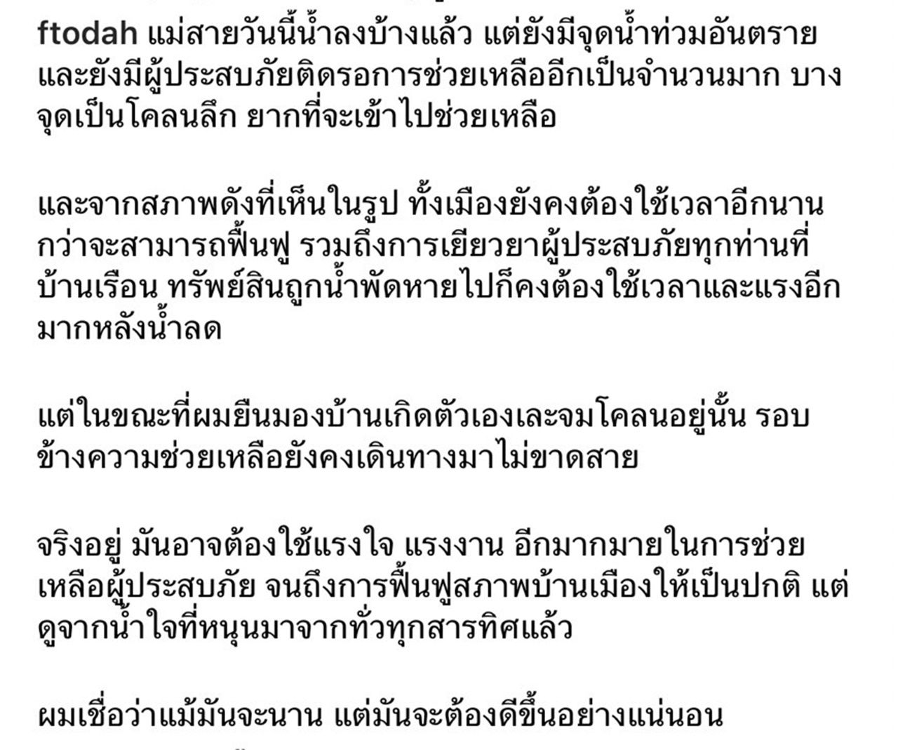 จริงอยู่ มันอาจต้องใช้แรงใจ แรงงานอีกมากมายในการช่วยเหลือผู้ประสบภัย จนถึงการฟื้นฟูสภาพบ้านเมืองให้เป็นปกติ แต่ดูจากน้ำใจที่หนุนมาจากทั่วทุกสารทิศแล้ว ผมเชื่อว่าแม้มันจะนาน แต่มันจะต้องดีขึ้นอย่างแน่นอน"