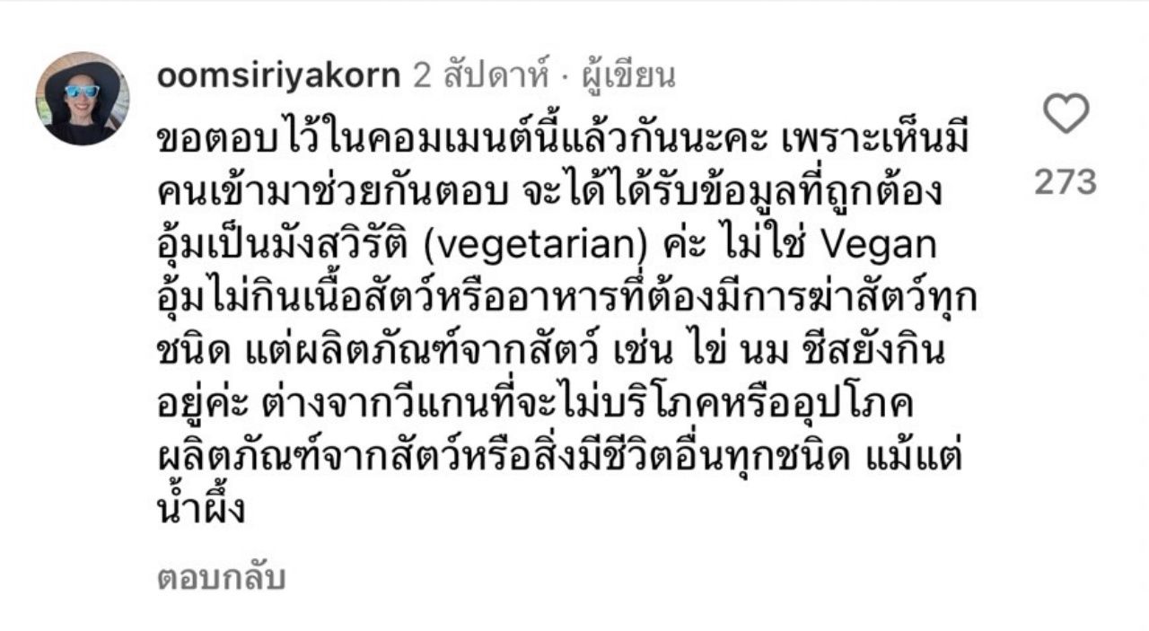 ด้าน อุ้ม ก็ได้เข้ามาคอมเมนต์ตอบกลับ เพื่ออธิบายให้เข้าใจตรงกัน บอกว่า "ขอตอบไว้ในคอมเมนต์นี้แล้วกันนะคะ เพราะเห็นมีคนเข้ามาช่วยกันตอบ จะได้ได้รับข้อมูลที่ถูกต้อง อุ้มเป็นมังสวิรัติ (vegetarian) ค่ะ ไม่ใช่ vegan อุ้มไม่กินเนื้อสัตว์หรืออาหารที่ต้องมีการฆ่าสัตว์ทุกชนิด แต่ผลิตภัณฑ์จากสัตว์ เช่น ไข่ นม ชีส ยังกินอยู่ค่ะ ต่างจากวีแกนที่จะไม่บริโภคหรืออุปโภคผลิตภัณฑ์จากสัตว์หรือสิ่งมีชีวิตอื่นทุกชนิด แม้แต่น้ำผึ้ง"