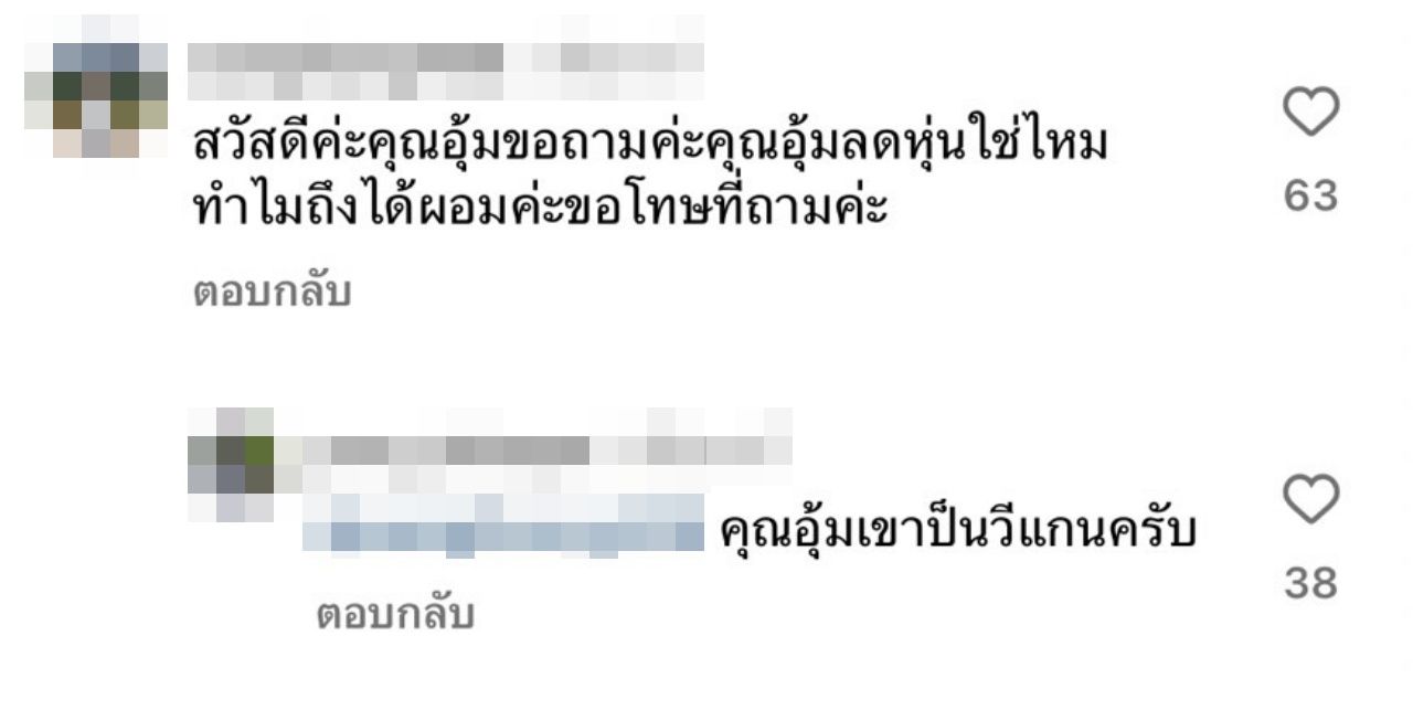 แต่ในขณะเดียวกันก็ได้มีคนเข้ามาคอมเมนต์ถามเกี่ยวกับสุขภาพของ อุ้ม อยู่บ่อยครั้ง บางคนยังได้ทักว่า อุ้มผอมมาก อยู่เป็นระยะ อย่างในก่อนหน้านี้ก็ได้มีคนเข้ามาคอมเมนต์ถามในคลิปของอุ้มที่กำลังเก็บถั่วฝักยาวมาทำส้มตำมังสวิรัติสุดแซ่บ โดยถามว่า "สวัสดีค่ะคุณอุ้ม ขอถามค่ะ คุณอุ้มลดหุ่นใช่ไหม ทำไมถึงได้ผอมคะ ขอโทษที่ถามค่ะ" ซึ่งก็ได้มีแฟน ๆ เข้ามาช่วยตอบกลับแทนบอกว่า "คุณอุ้มเขาเป็นวีแกนครับ"