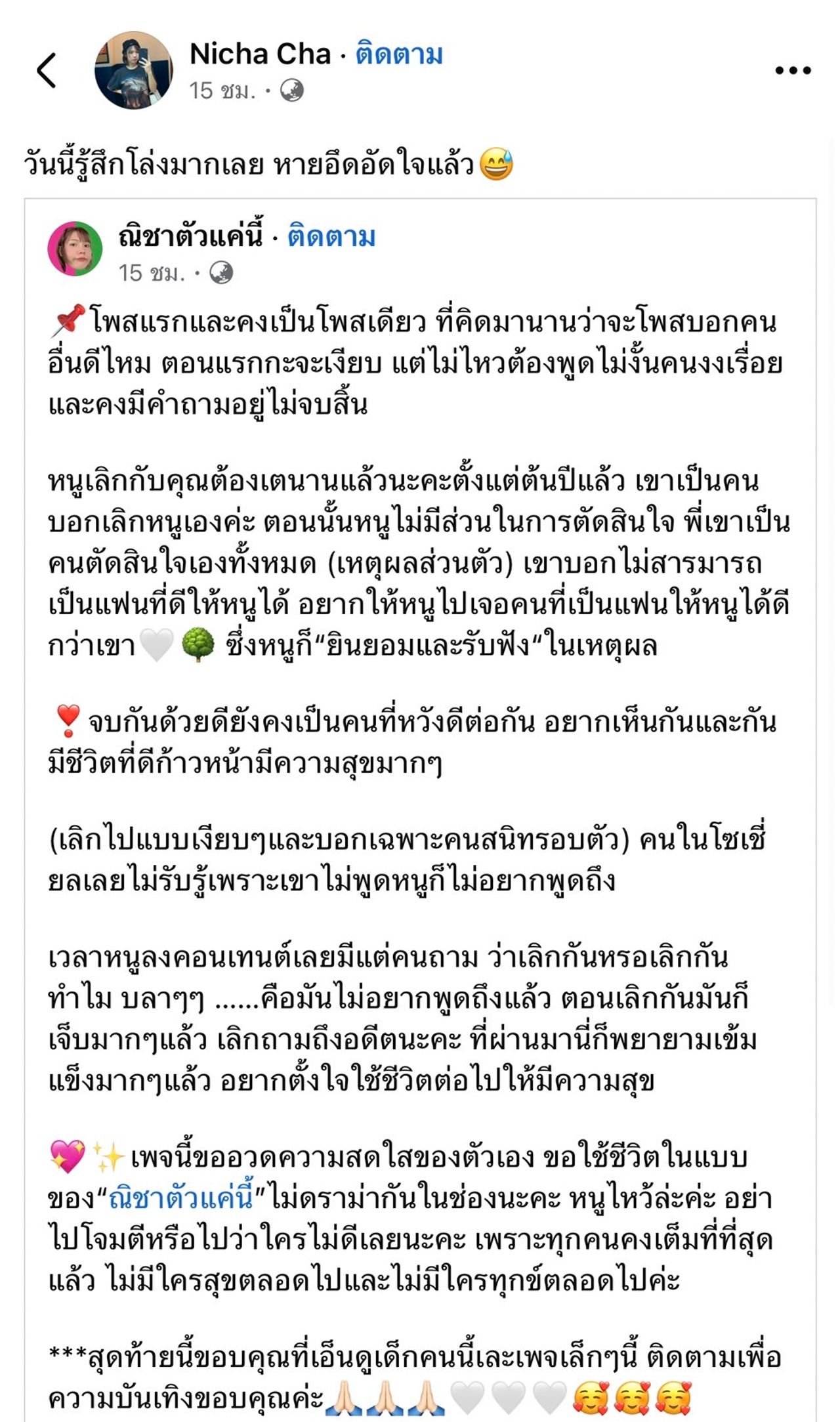 เวลาหนูลงคอนเทนต์เลยมีแต่คนถาม ว่าเลิกกันหรอเลิกกันทำไม บลาๆๆ ......คือมันไม่อยากพูดถึงแล้ว ตอนเลิกกันมันก็เจ็บมากๆแล้ว เลิกถามถึงอดีตนะคะ ที่ผ่านมานี่ก็พยายามเข้มแข็งมากๆแล้ว อยากตั้งใจใช้ชีวิตต่อไปให้มีความสุขเพจนี้ขออวดความสดใสของตัวเอง ขอใช้ชีวิตในแบบของ"ณิชาตัวแค่นี้"ไม่ดราม่ากันในช่องนะคะ หนูไหว้ล่ะค่ะ อย่าไปโจมตีหรือไปว่าใครไม่ดีเลยนะคะ เพราะทุกคนคงเต็มที่ที่สุดแล้ว ไม่มีใครสุขตลอดไปและไม่มีใครทุกข์ตลอดไปค่ะ