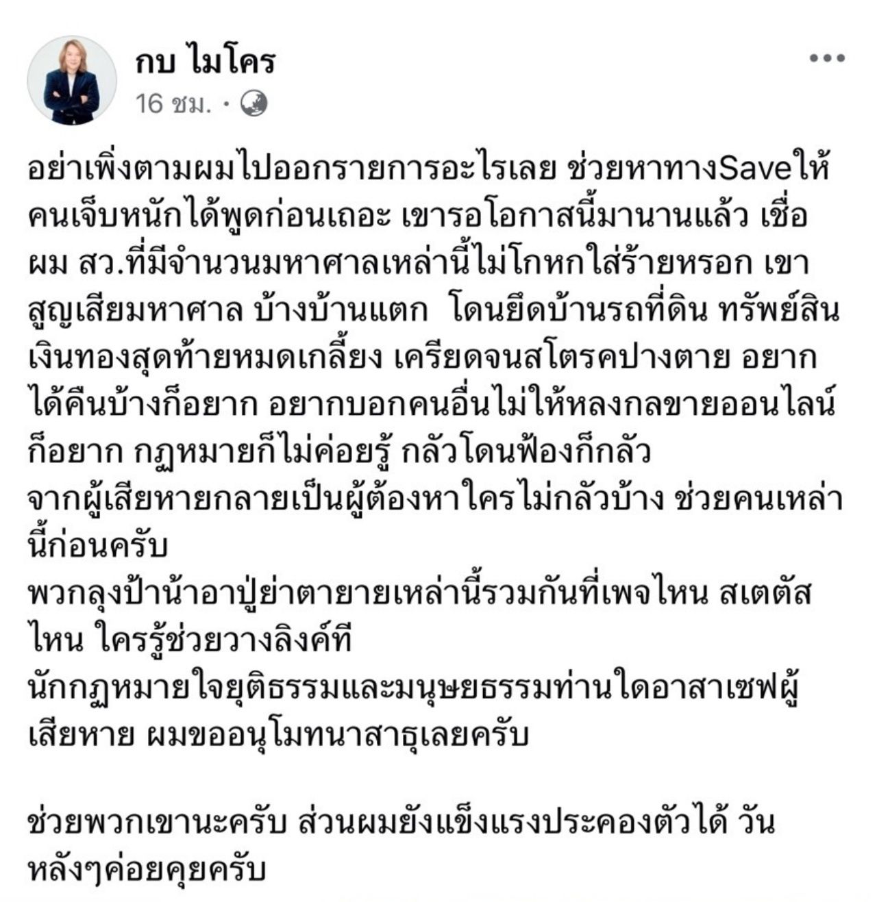 จากนั้น กบ ก็ได้โพสต์ข้อความผ่านเฟซบุ๊กส่วนตัว บอกว่า "อย่าเพิ่งตามผมไปออกรายการอะไรเลย ช่วยหาทาง Save ให้คนเจ็บหนักได้พูดก่อนเถอะ เขารอโอกาสนี้มานานแล้ว เชื่อผม สว. ที่มีจำนวนมหาศาลเหล่านี้ไม่โกหกใส่ร้ายหรอก เขาสูญเสียมหาศาล บ้างบ้านแตก โดนยึดบ้านรถที่ดิน ทรัพย์สินเงินทองสุดท้ายหมดเกลี้ยง เครียดจนสโตรกปางตาย อยากได้คืนบ้างก็อยาก อยากบอกคนอื่นไม่ให้หลงกลขายออนไลน์ก็อยาก กฎหมายก็ไม่ค่อยรู้ กลัวโดนฟ้องก็กลัว