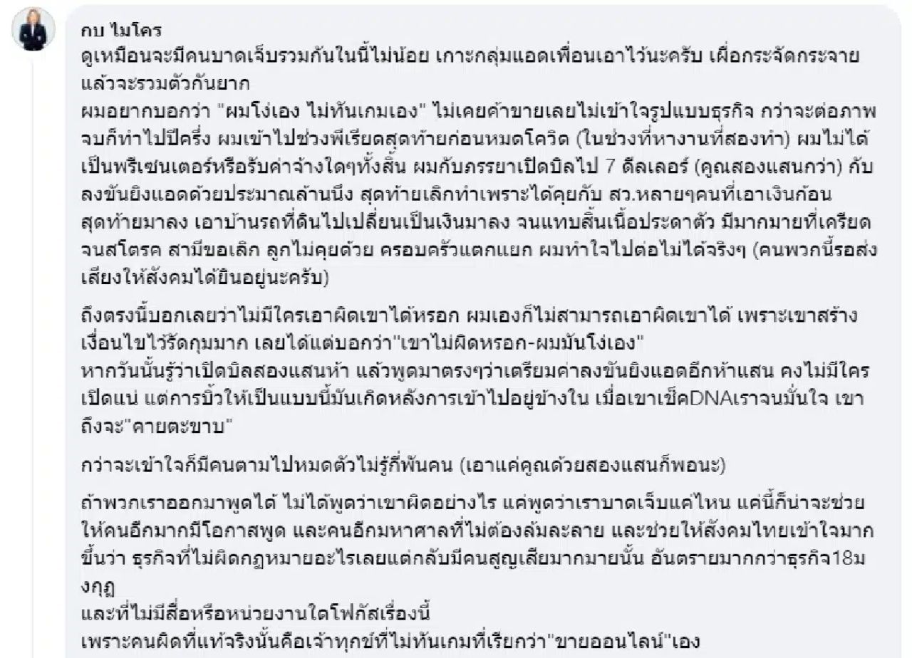 เพราะคนผิดที่แท้จริงนั้นคือเจ้าทุกข์ที่ไม่ทันเกมที่เรียกว่า "ขายออนไลน์" เอง ผมรู้ว่าคนของพวกบอสเห็นคอมเมนต์ของผม ฝากไปบอกว่าบุญส่วนบุญ บาปส่วนบาป เอามาทดแทนกันไม่ได้ อะไรที่ทำแล้วดีก็ขอให้รุ่งเรือง อะไรที่เลวร้ายที่รู้อยู่แก่ใจ ขอให้เป็นไปตามกฎแห่งกรรม"