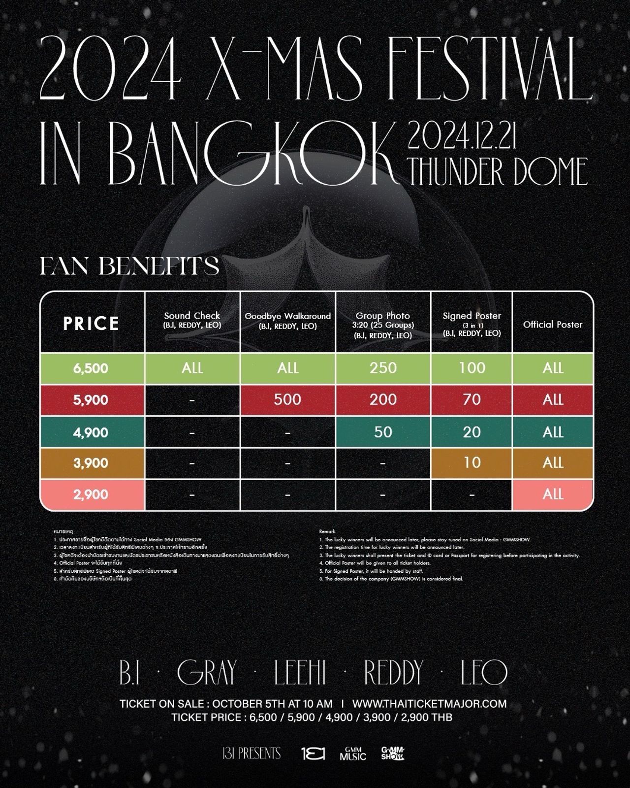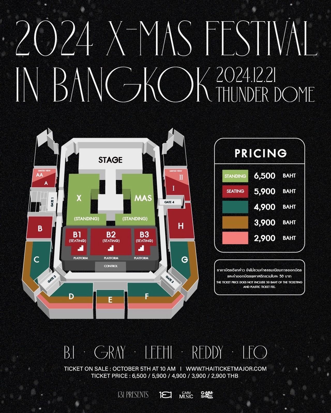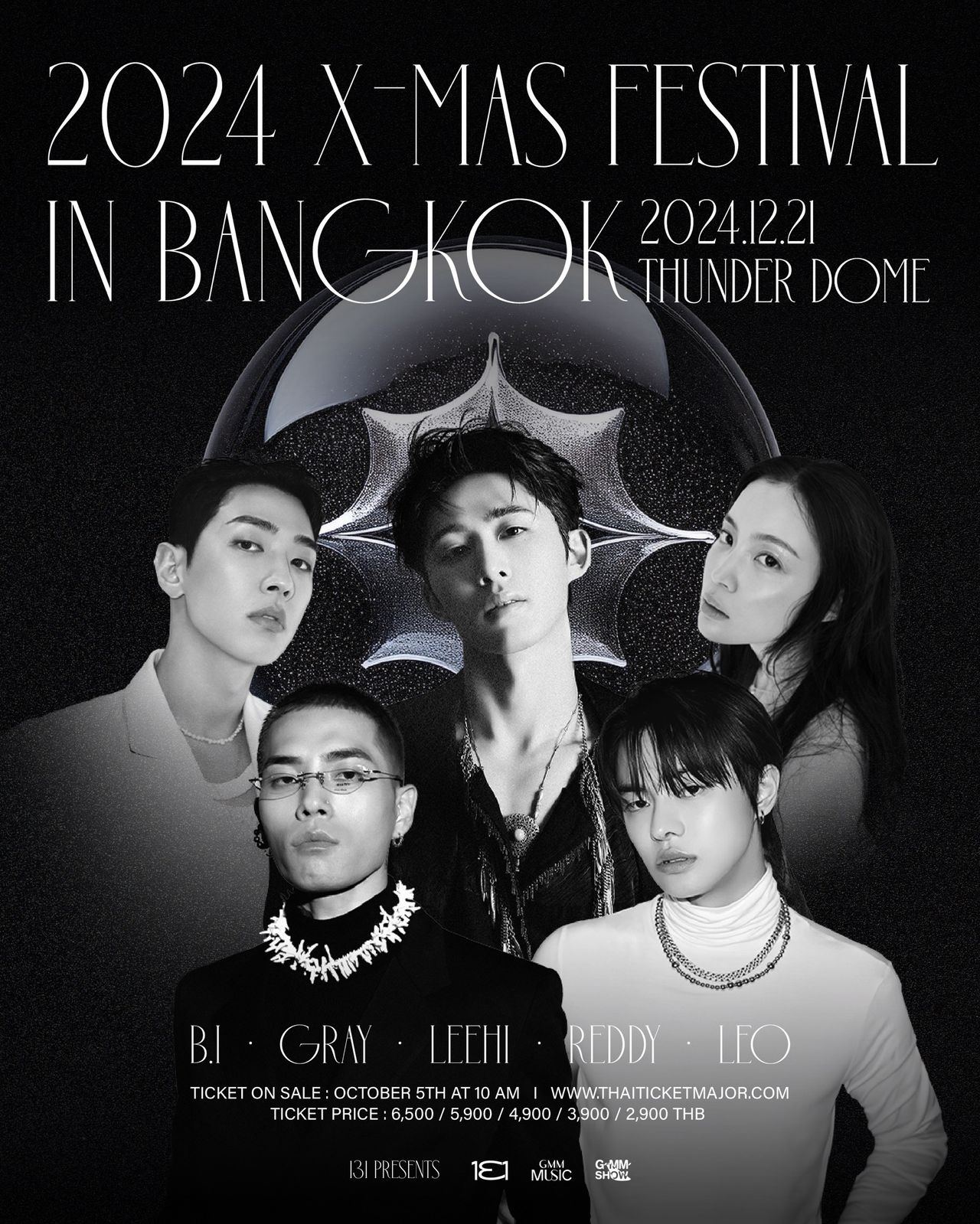 คริสต์มาสนี้จะไม่เหงา เพราะผู้จัด GMM SHOW ขอส่งมอบความสุข สนุกส่งท้ายปี ฉลอง X- mas กับงาน “131 Presents : 2024 X-mas Festival in Bangkok” ส่งความสนุกกับ 5 ศิลปิน B.I, GRAY, LeeHi, REDDY, LEO รอรับแรงกระแทกความมันส์ไปพร้อมกัน วันเสาร์ที่ 21 ธันวาคมนี้ ณ ธันเดอร์โดม เมืองทองธานี
