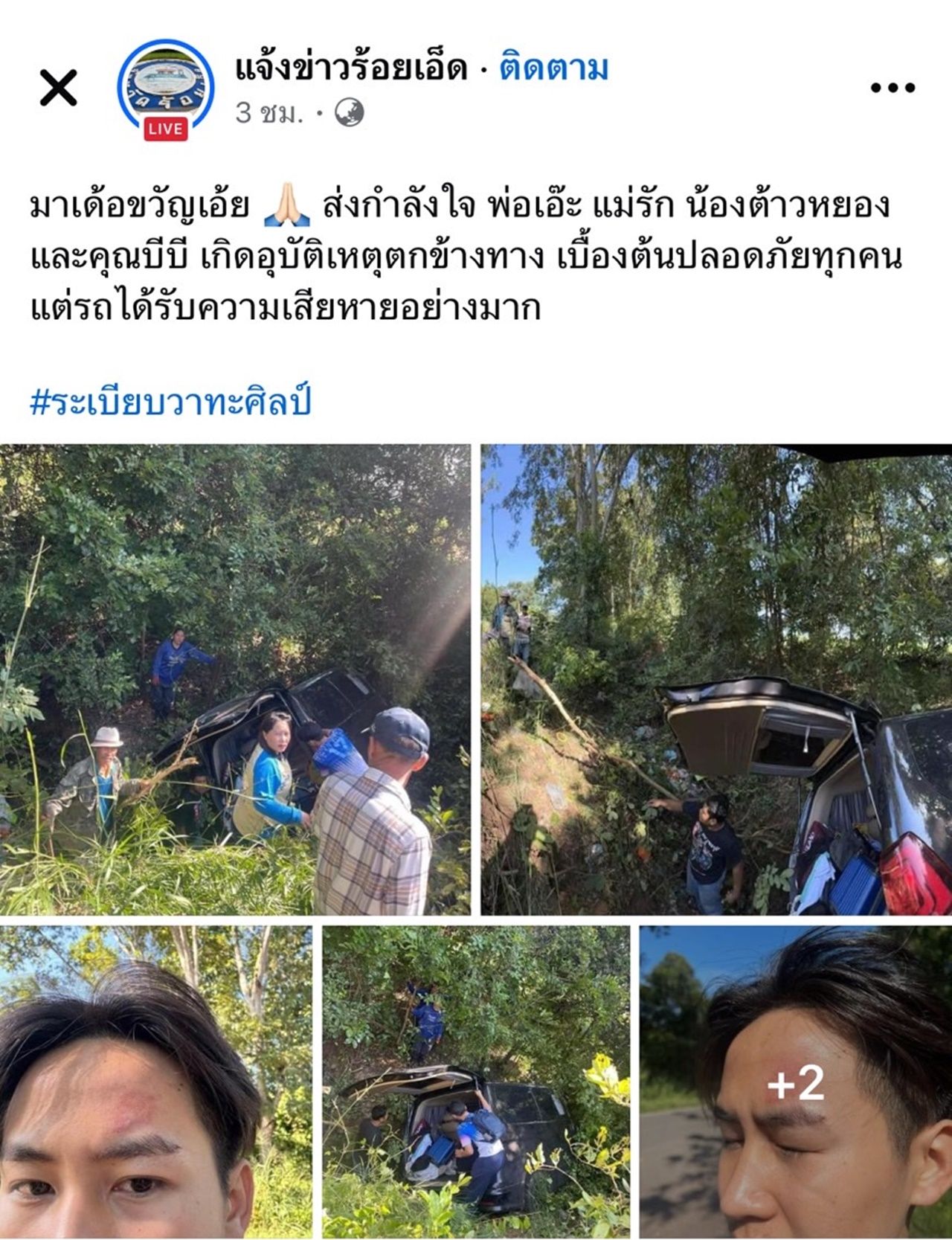 ทำเอาแฟนคลับต่างใจหาย หลังได้รับทราบข่าวจากเฟซบุ๊กของ ระเบียบวาทะศิลป์ แฟนเพจ ที่ได้โพสต์ภาพรถยนต์ ที่มี พ่อเอ๊ะ ระเบียบวาทะศิลป์ แม่รัก ต้าวหยอง และ บีบี นั่งโดยสารมานั้น ได้ตกลงข้างทาง