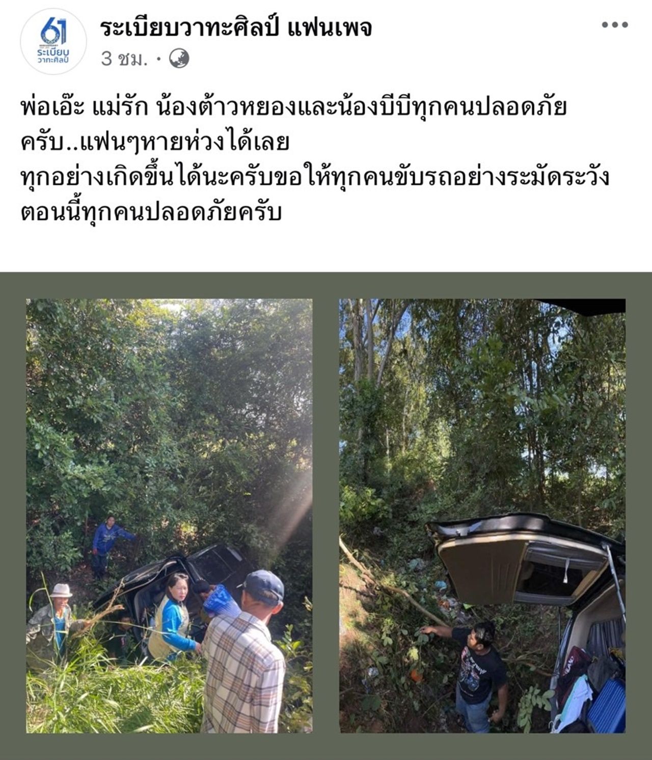 "พ่อเอ๊ะ แม่รัก น้องต้าวหยองและน้องบีบีทุกคนปลอดภัยครับ..แฟนๆหายห่วงได้เลย ทุกอย่างเกิดขึ้นได้นะครับขอให้ทุกคนขับรถอย่างระมัดระวังตอนนี้ทุกคนปลอดภัยครับ"