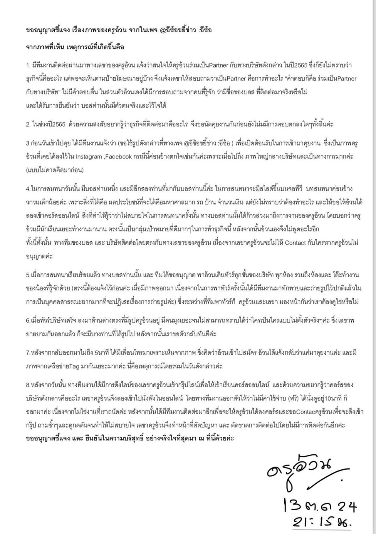8.หลังจากวันนั้น ทางทีมงานได้ดึงไลน์ของเลขาครูอ้วนเข้ากรุ๊ปไลน์ เพื่อให้เข้าเรียนคอร์สออนไลน์ และด้วยความอยากรู้ว่าคอร์สของบริษัทดังกล่าวคืออะไร เลขาครูอ้วนจึงเข้าไปนั่งฟังในออนไลน์ โดยทางทีมงานออกตัวให้ว่า ไม่มีค่าใช้จ่าย (ฟรี) แต่นั่งฟังอยู่ 10 นาที ก็ออกมาค่ะ เนื่องจากไม่ใช่งานที่เราถนัดค่ะ หลังจากนั้นทีมงานได้ติดต่อเข้ามาอีก เพื่อให้ครูอ้วนได้ลงคอร์ส และขอคอนแท็ค ครูอ้วน เพื่อจะดึงเข้ากรุ๊ป ถามซ้ำๆ และถูกกดดันจนทำให้ไม่สบายใจ เลขาครูอ้วนจึงทำหน้าที่ตัดปัญหา และตัดขาดการติดต่อกันอีกทันทีค่ะ