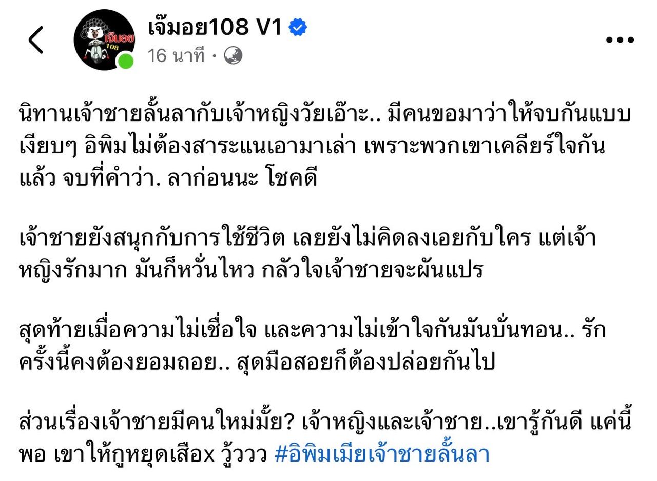 มีเรื่องมาให้ชาวเน็ตได้ตามเผือกกันอีกแล้ว หลังจากที่เพจดังเจ๊มอย 108 ออกมาเล่านิทานเจ้าชายลั้นลากับเจ้าหญิงวัยเอ๊าะ งานนี้ทำเอาชาวเน็ตต่างพากันสนใจและแห่ทายกันเพียบ