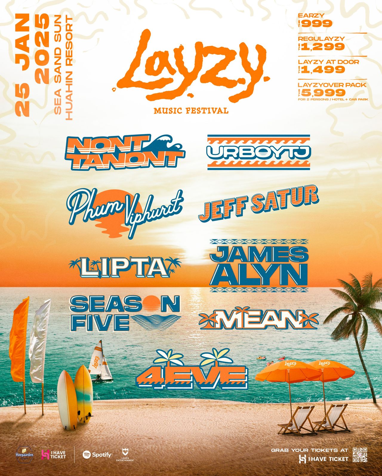 มาร่วมสร้างประสบการณ์สุดพิเศษที่ Layzy Music Festival กัน Let's Lay Down & See! วันที่ 25 มกราคม 2568 สถานที่ SEA SAND SUN HUAHIN RESORT บัตรราคา EARZY 999.-, REGULAYZY 1,299.-, LAYZY AT DOOR 1,499.-, LAYZYOVER Package 5,999.- (รวมบัตรเข้าร่วมงาน ที่พัก 1 คืน อาหาร และกิจกรรมพิเศษ)