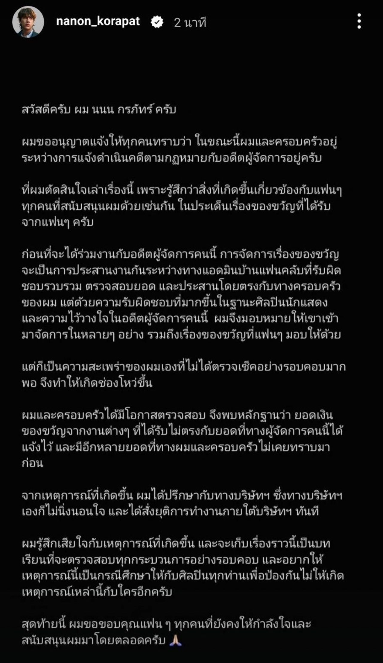 "สวัสดีครับผม นนน กรภัทร์ ครับ ผมขออนุญาตแจ้งให้ทุกคนทราบว่า ในขณะนี้ผมและครอบครัวอยู่ ระหว่างการแจ้งดำเนินคดีตามกฎหมายกับอดีตผู้จัดการอยู่ครับ ที่ผมตัดสินใจเล่าเรื่องนี้ เพราะรู้สึกว่าสิ่งที่เกิดขึ้นเกี่ยวข้องกับแฟน ๆ ทุกคนที่สนับสนุนผมด้วยเช่นกัน ในประเด็นเรื่องของขวัญที่ได้รับจากแฟนๆ ครับ