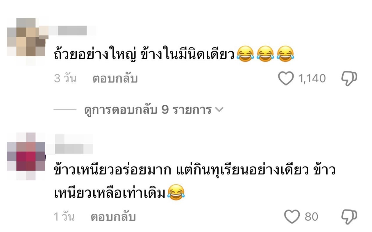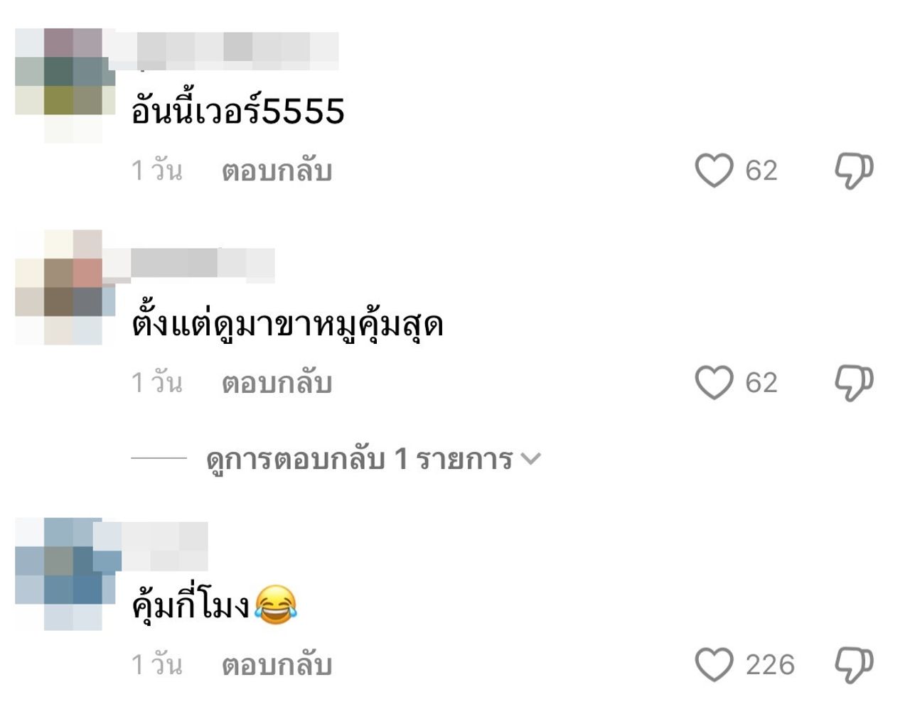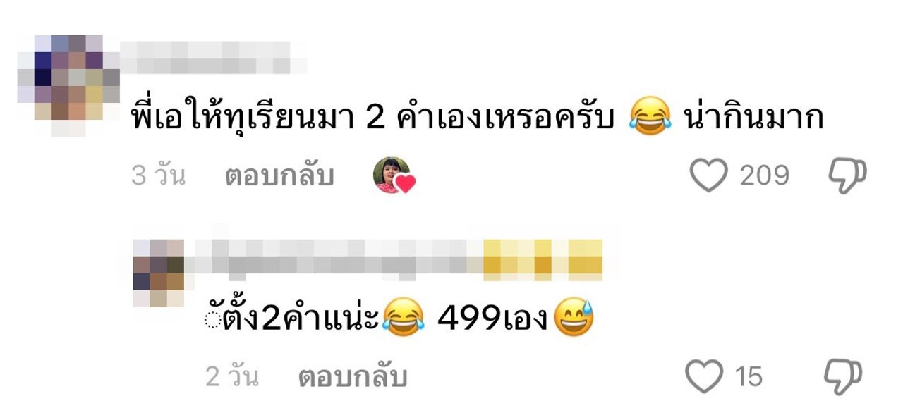 "พี่เอให้ทุเรียนมา 2 คำเองเหรอครับ น่ากินมาก, 499 นี่แพงตรงข้าวเหนียวใช่มั้ย, ตั้งแต่ดูมา อันนี้ปริมาณสวนทางกับราคาที่สุด, ข้าวเหนียวอร่อยมาก แต่กินทุเรียนอย่างเดียว ข้าวเหนียวเหลือเท่าเดิม, ถ้วยอย่างใหญ่ ข้างในมีนิดเดียว, คุ้มกี่โมง, ตั้งแต่ดูมาขาหมูคุ้มสุด, คุ้มกี่โมง เมนูที่คุ้มสุดคือ ขาหมูพะโล้ นอกนั้น สวนทางกัน"
