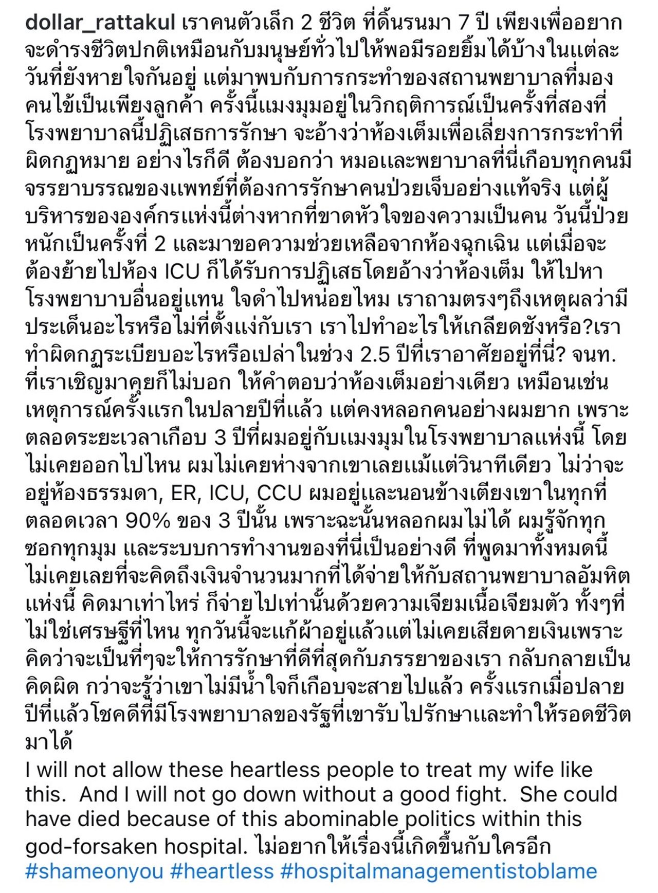 I will not allow these heartless people to treat my wife like this. And I will not go down without a good fight. She could have died because of this abominable politics within this god-forsaken hospital. ไม่อยากให้เรื่องนี้เกิดขึ้นกับใครอีก #shameonyou #heartless #hospitalmanagementistoblame"