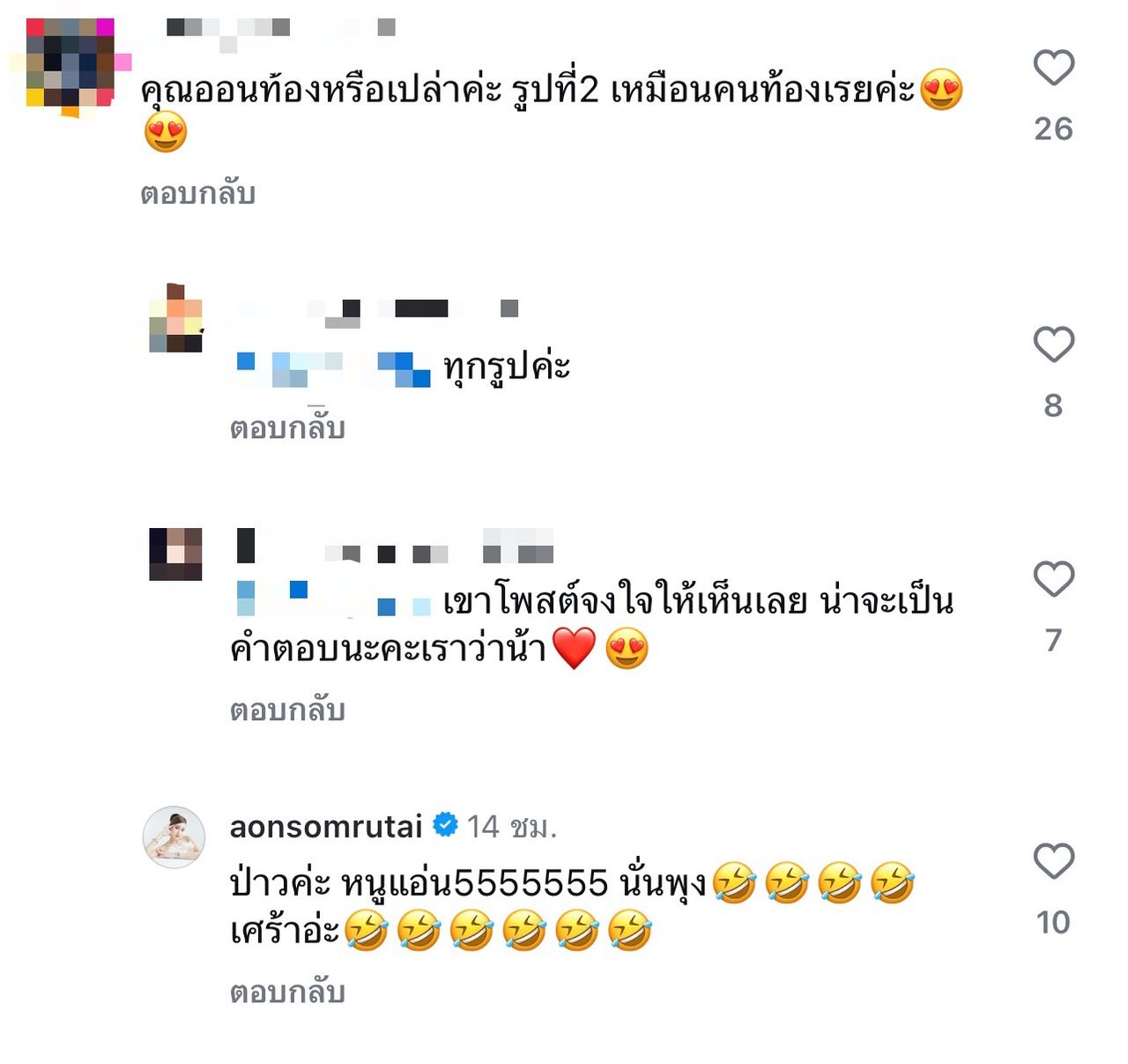 งานนี้ภาพที่ถูกโพสต์ออกไป หลายคนต่างโฟกัสไปที่ น้องออน โดยเฉพาะท้องน้อยๆ ที่นูนเด่นอย่างเห็นได้ชัดเจน เลยอดสงสัยไม่ได้ว่าจะมีข่าวดีหรือเปล่า และไม่ปล่อยให้คนรอนาน สาวออน ก็ได้ออกมาชี้แจงแล้วว่า "ป่าวค่ะ หนูแอ่น5555555 นั่นพุง เศร้าอ่ะ' และ 'Hi girls!!! I'm not pregnant that's my belly!!"