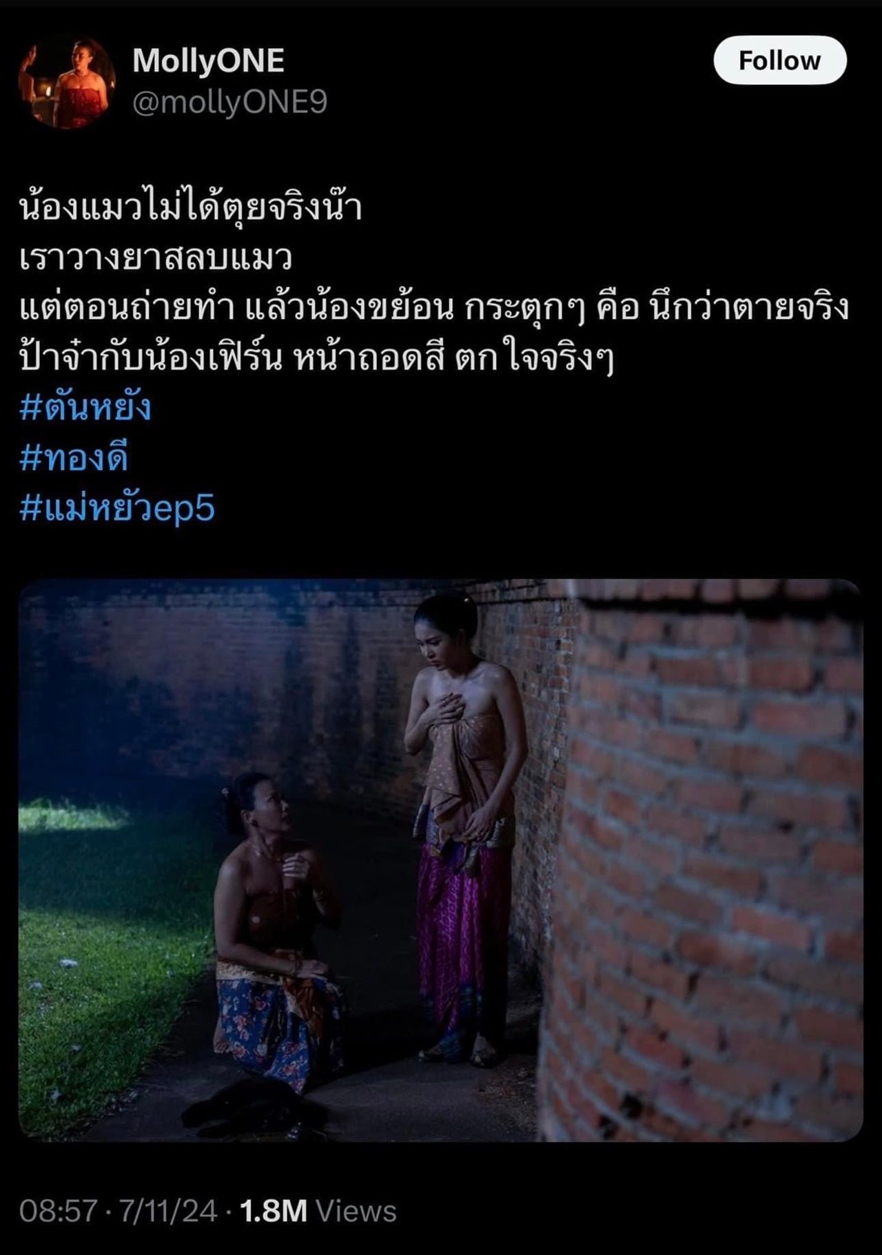 - ล่าสุด แม่หยัว เดินทางมาถึง EP.5 แล้ว เป็นฉากที่ "พระสนมตันหยง" (ที่รับบทโดย เฟิร์น นพจิรา) ระแวงว่าจะถูกวางยาในน้ำชา จึงให้พี่เลี้ยงชื่อ "ทองดี" (รับบทโดย จ๋า โมฬีวรรณ) เอาน้ำชาไปทดสอบให้แมวดำกินก่อน ปรากฏว่าแมวกินแล้วชักกระตุกเสียชีวิตต่อหน้าต่อตา ซึ่งฉากนี้ชาวเน็ตต่างคอมเมนต์แซวบอกทำนองว่าแมวแสดงสมจริงมาก แบบนี้ต้องได้รางวัล รวมไปถึง "บิ๊นท์ สิรีธร" ที่รับบท ละอองคำ ก็ได้โพสต์ว่า "ต้องมีชื่อเข้าชิง!!"