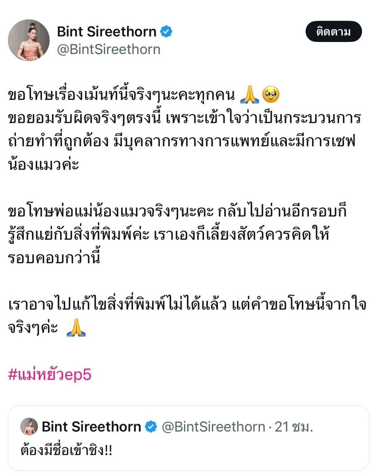 - ยังมีการตำหนิ บิ๊นท์ สิรีธร ลีห์อร่ามวัฒน์ หนึ่งในนักแสดงในเรื่อง ซึ่งเคยเป็นเภสัชกรมาก่อน แต่กลับโพสต์แสดงความคิดเห็นเกี่ยวกับฉากแมวว่า "ต้องมีชื่อเข้าชิง!!" ซึ่งต่อมา บิ๊นท์ ได้โพสต์ขอโทษ และประกาศไม่สนับสนุนการทารุณกรรมสัตว์ทุกประเภท พร้อมกับเสนอให้ใช้ซีจี หรือม็อกอัพแทน