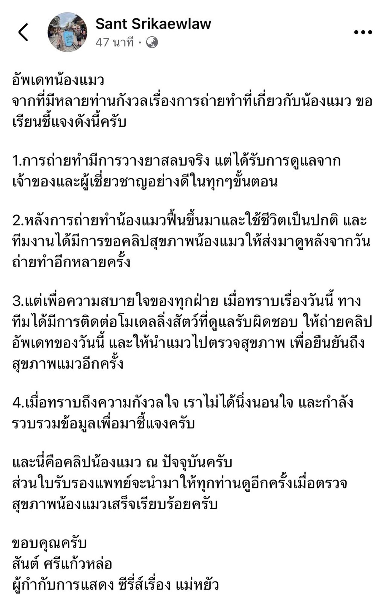 - ในเวลาต่อมา"สันต์ ศรีแก้วหล่อ" ผู้กำกับละครเรื่องนี้ ออกมายอมรับว่ามีการวางยาสลบแมวจริง แต่ทุกขั้นตอนได้รับการดูแลจากเจ้าของและผู้เชี่ยวชาญดูแลเป็นอย่างดี ส่วนตัวแมวยังคงใช้ชีวิตตามปกติ ไม่ได้เสียชีวิต พร้อมโพสต์คลิปสั้นๆ ของแมว บอกว่าเป็นคลิป ณ ปัจจุบัน และจะเอาใบรับรองแพทย์มาให้ดูอีกครั้งเมื่อตรวจเสร็จแล้ว