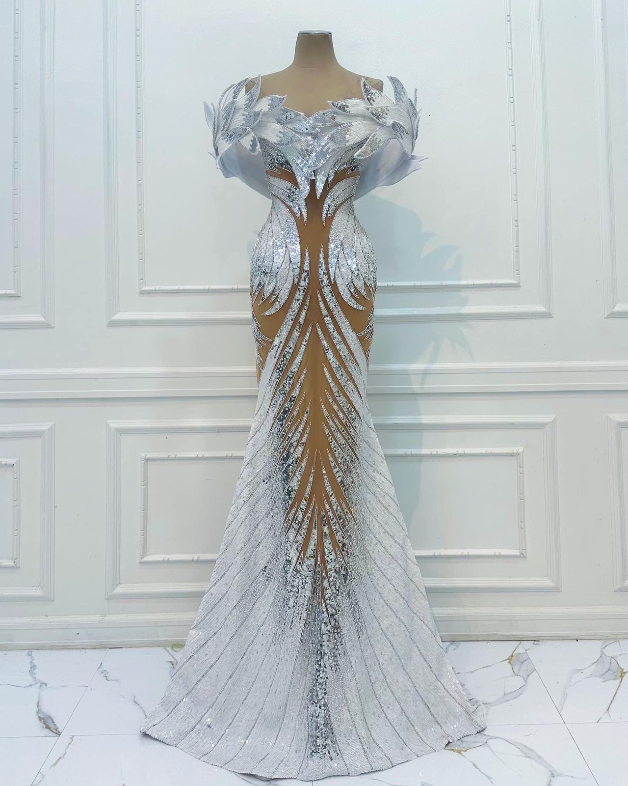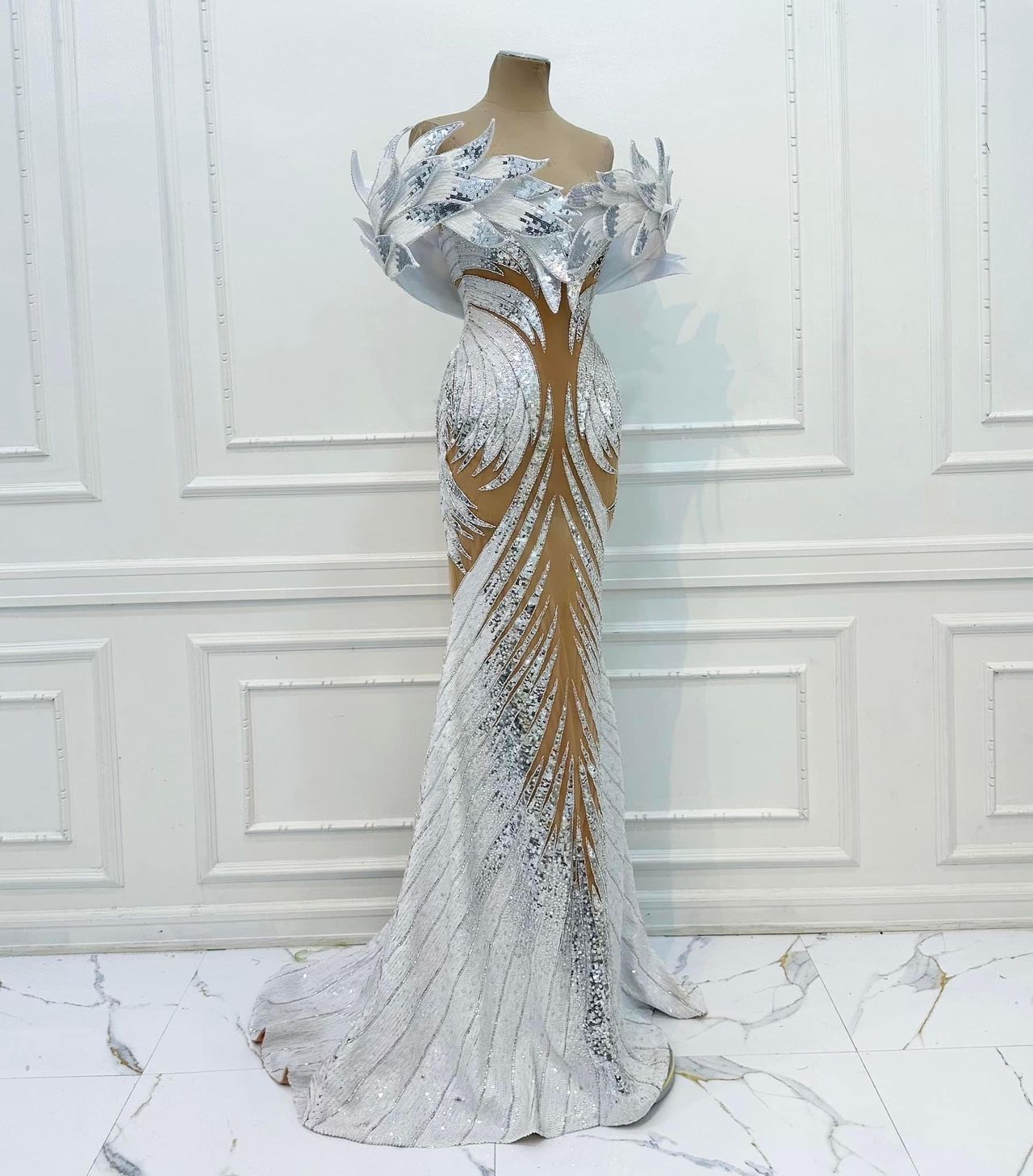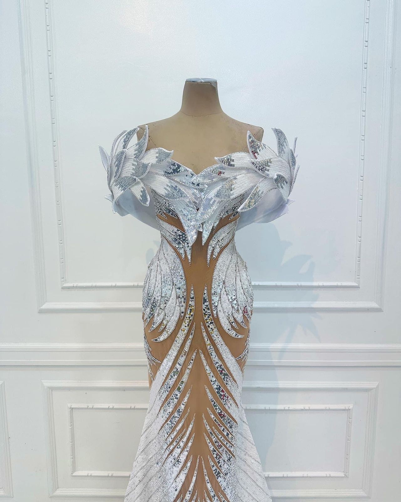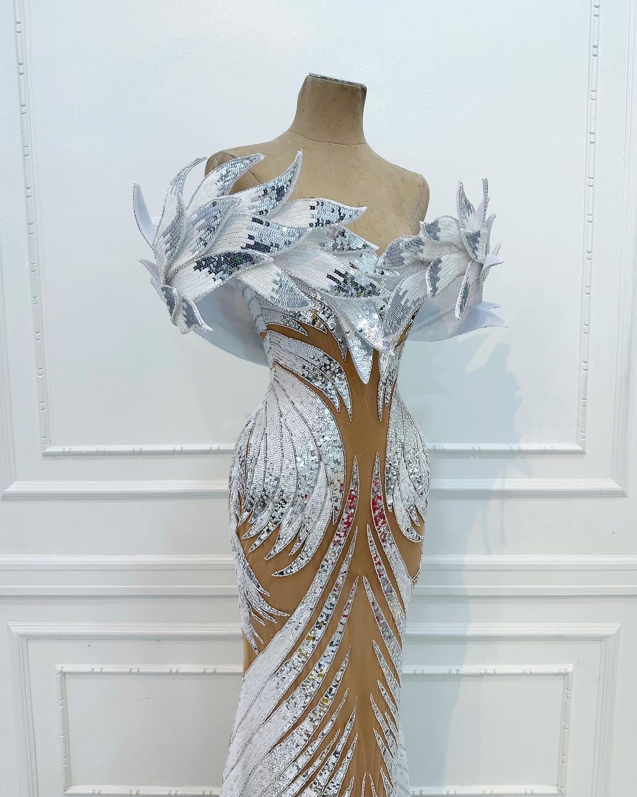 ในส่วนของชุดราตรีที่ทุกคนรอคอย “โอปอล สุชาตา” พรีเซนต์ในชุด “Swan Maiden (หงส์สาว)” ออกแบบโดย Rian Fernandez ได้รับแรงบันดาลใจจากตำนานหญิงสาวแห่งหงส์ โดดเด่นด้วยงานปักมืออันละเอียดอ่อนจากเลื่อมสีขาวบริสุทธิ์และสีเงิน สะท้อนถึงประกายของน้ำที่เปล่งประกายใต้แสงจันทร์