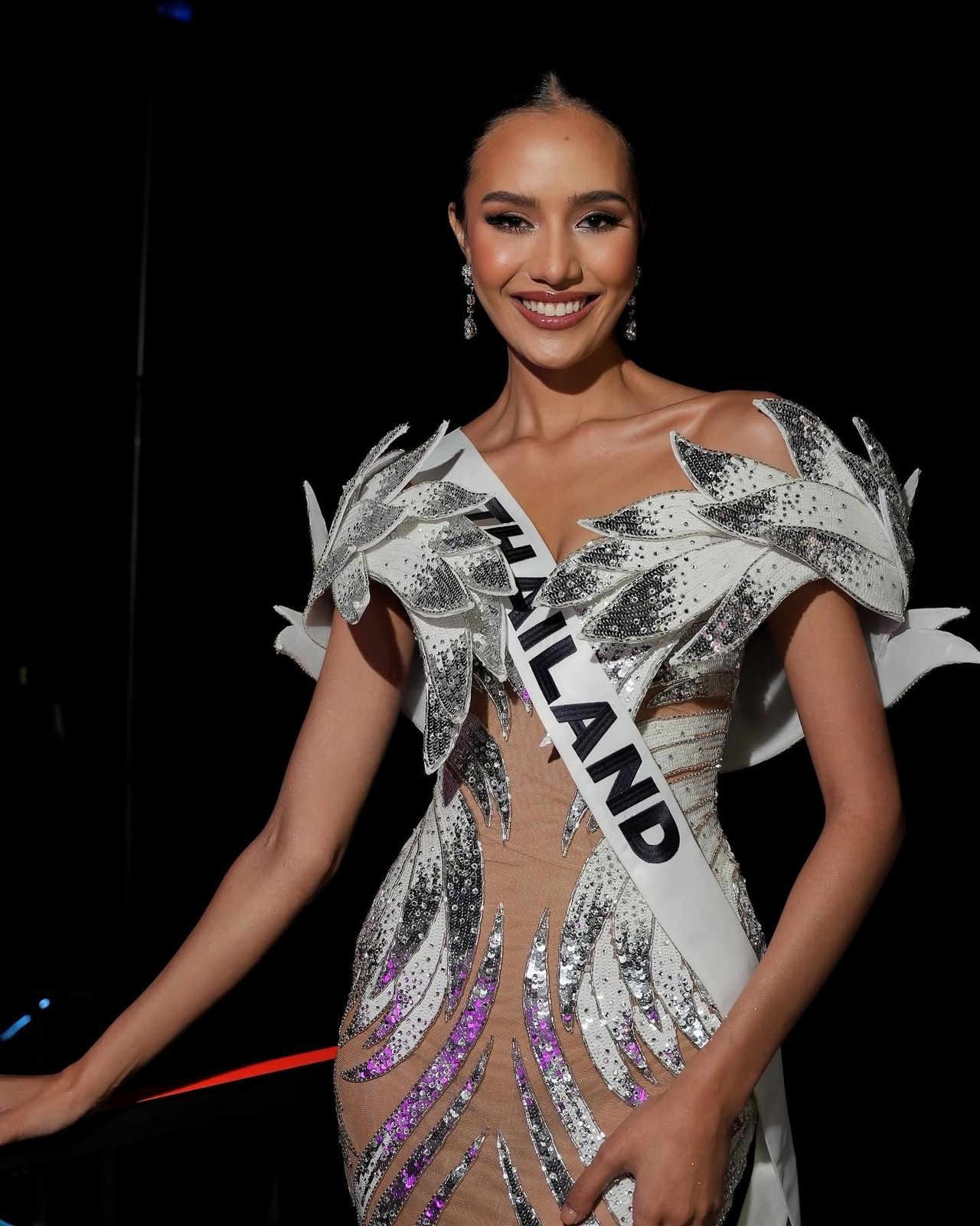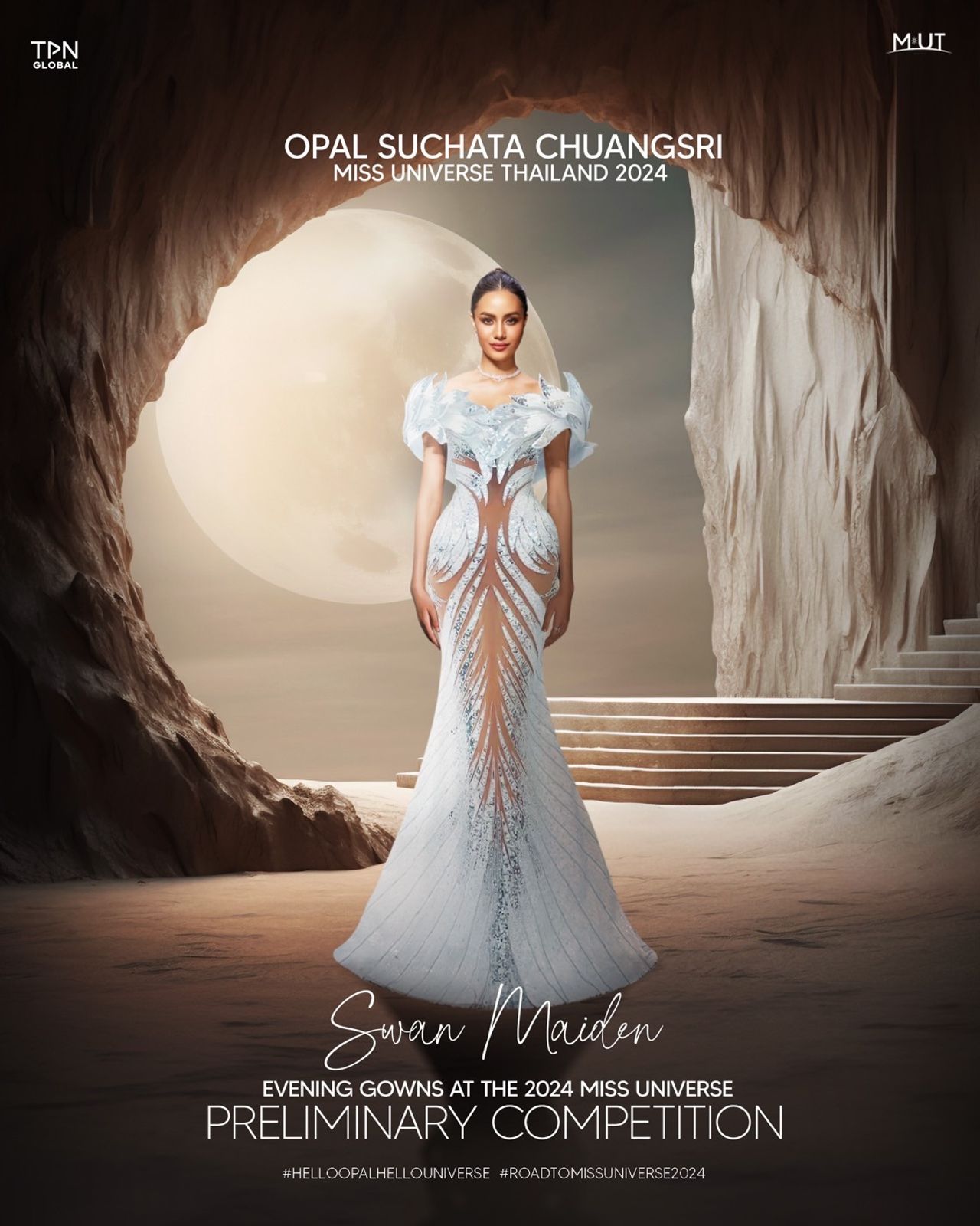 ชุดราตรี Swan Maiden ถูกสร้างสรรค์ด้วยมืออย่างพิถีพิถัน สะท้อนถึงความสง่างามและพลังแห่งการเปลี่ยนแปลงของหงส์ในตำนาน บนเวที Miss Universe นอกจากนี้ “โอปอล - สุชาตา ช่วงศรี” ยังได้รับรางวัลพิเศษ CI - Talk : Voice for Change Silver อีกด้วย