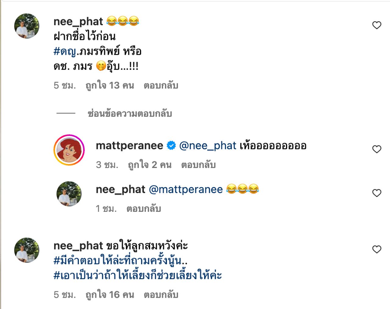 งานนี้คุณแม่ของสาวแมท ก็ได้เข้ามาคอมเมนต์รีบเสนอชื่อหลานทันที โดยคุณแม่ได้คอมเมนต์ว่า "ฝากชื่อไว้ก่อน ด.ญ.ภมรทิพย์ หรือ ด.ช. ภมร อุ๊บ!!" งานนี้ลูกสาวคนสวยก็ได้เข้ามาคอมเมนต์ตอบว่า "เห้อออออออออ"