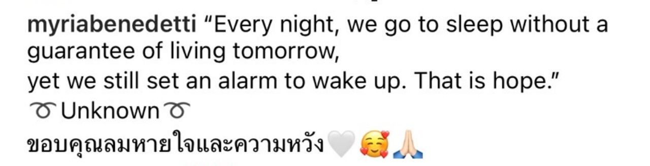 ล่าสุด นัท ก็ได้ออกมาโพสต์อินสตาแกรมพร้อมเขียนข้อความภาษาอังกฤษ บอกว่า “Every night, we go to sleep without a guarantee of living tomorrow, yet we still set an alarm to wake up. That is hope.” Unknown ขอบคุณลมหายใจและความหวัง" (ทุกคืน เราหลับไปโดยไม่รู้ว่าจะตื่นขึ้นมาอีกหรือไม่ ทว่าเรายังคงตั้งนาฬิกาปลุก นั่นแหละคือความหวัง ขอบคุณลมหายใจและความหวัง)
