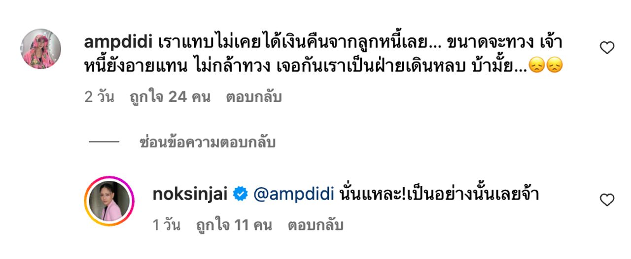นอกจากนี้ แอม เสาวลักษณ์ เข้ามาคอมเมนต์ว่า "เราแทบไม่เคยได้เงินคืนจากลูกหนี้เลย… ขนาดจะทวง เจ้าหนี้ยังอายแทน ไม่กล้าทวง เจอกันเราเป็นฝ่ายเดินหลบ บ้ามั้ย…" ซึ่ง นก สินจัย ก็ได้ตอบคอมเมนต์กลับไปว่า "นั่นแหละ! เป็นอย่างนั้นเลยจ้า"