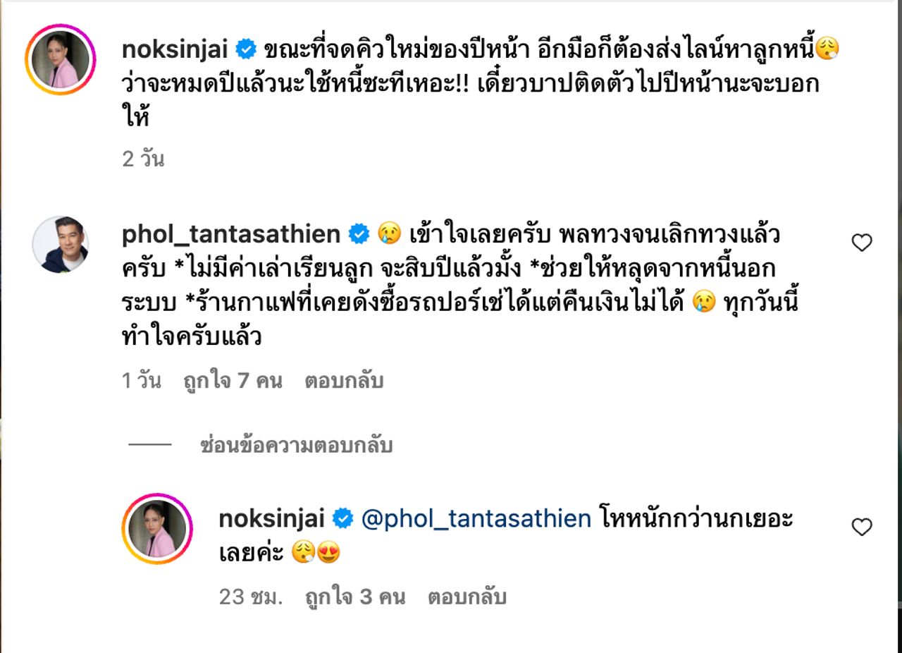 ทำเอาเพื่อนพ้องในวงการบันเทิงอย่าง พล ตัณฑเสถียร ก็ได้เข้ามาแชร์ประสบการณ์ในฐานะเจ้าหนี้ว่า “เข้าใจเลยครับ พลทวงจนเลิกทวงแล้วครับ *ไม่มีค่าเล่าเรียนลูก จะสิบปีแล้วมั้ง *ช่วยให้หลุดจากหนี้นอกระบบ *ร้านกาแฟที่เคยดังซื้อรถปอร์เช่ได้แต่คืนเงินไม่ได้ทุกวันนี้ ทำใจครับแล้ว” ทำเอาเจ้าของโพสต์ต้องเข้ามาคอมเมนต์ตอบกลับว่า “โหหนักกว่านกเยอะเลยค่ะ”