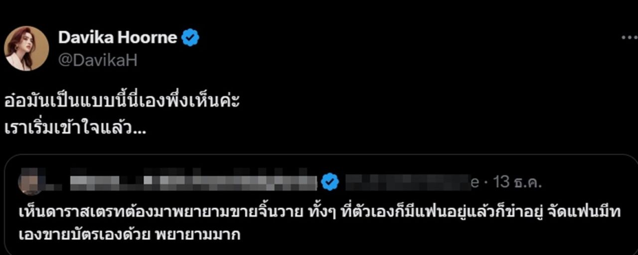 - ใหม่ ดาวิกา เห็นข้อความดังกล่าว จึงได้รีทวีตพร้อมเขียนเอาไว้ว่า "อ๋อมันเป็นแบบนี้นี่เองเพิ่งเห็นค่ะ เราเริ่มเข้าใจแล้ว..."