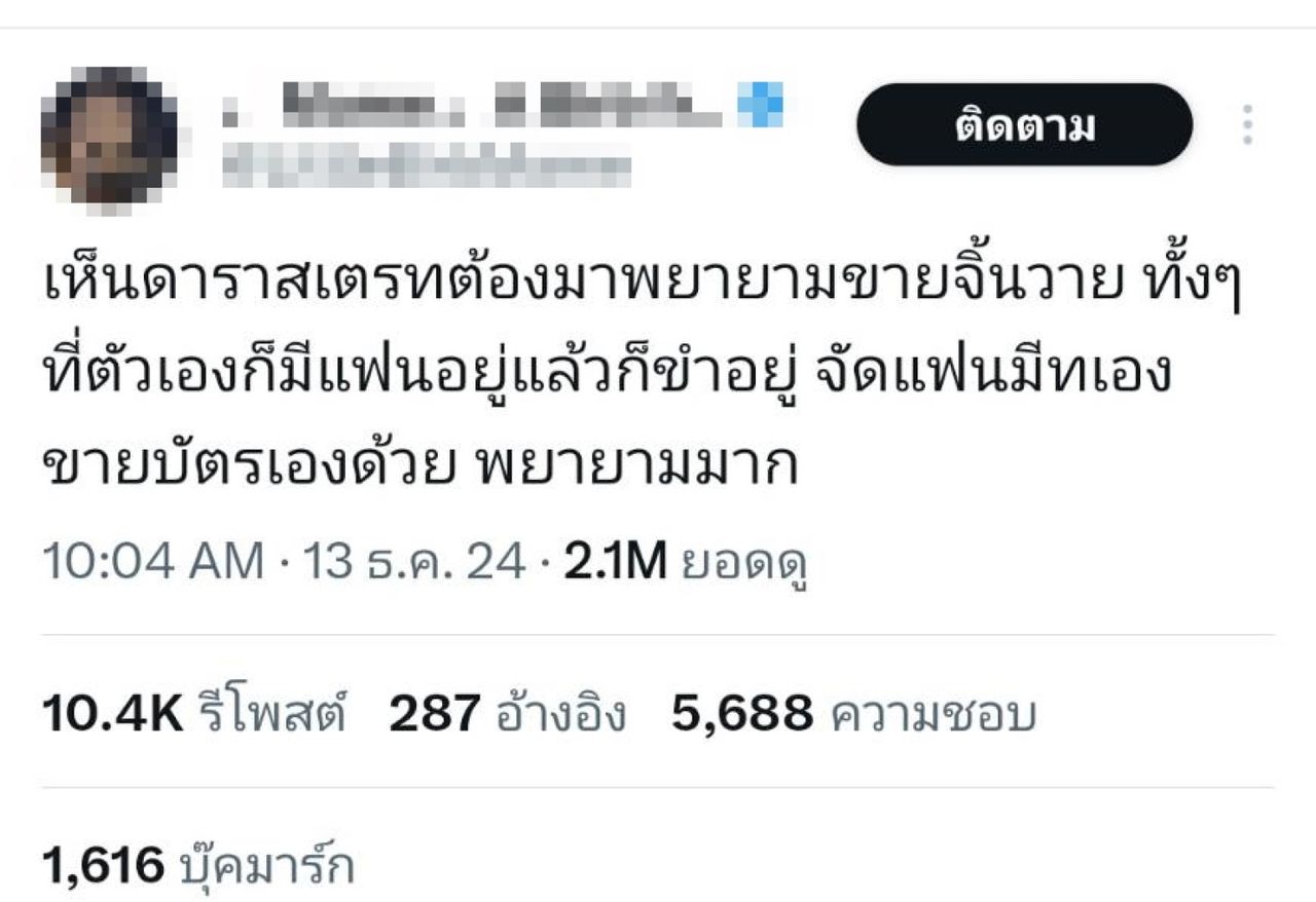 - มีคนในโซเชียล X ทวีตข้อความเกี่ยวกับดาราขายคู่จิ้นทั้งที่ตัวเองมีแฟนอยู่แล้วว่า "เห็นดาราสเตรทต้องมาพยายามขายจิ้นวาย ทั้งๆ ที่ตัวเองก็มีแฟนอยู่แล้วก็ขำอยู่ จัดแฟนมีตเองขายบัตรเองด้วย พยายามมาก"