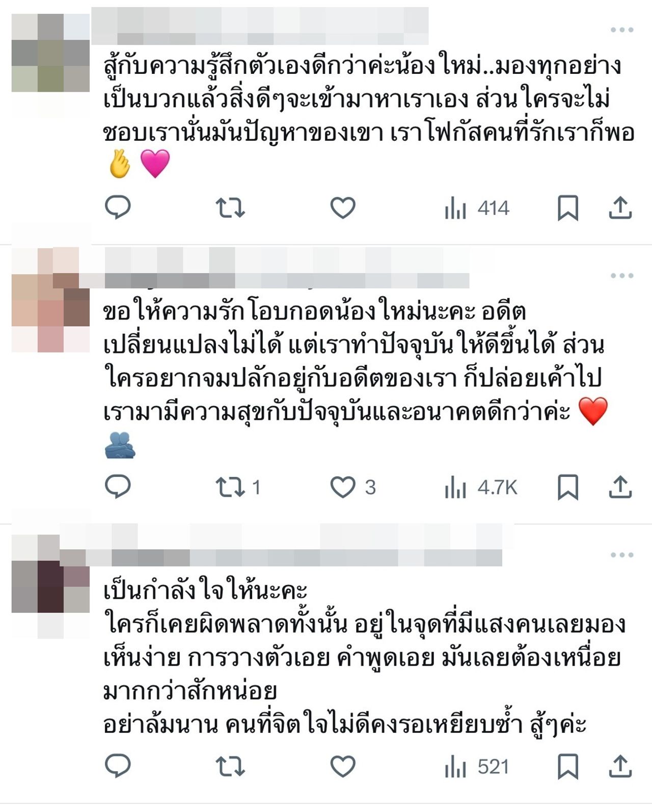 งานนี้ก็มีชาวเน็ตเข้ามาคอมเมนต์แสดงความคิดเห็นต่างๆ มากมาย อาทิ "ขอให้ความรักโอบกอดน้องใหม่นะคะ อดีตเปลี่ยนแปลงไม่ได้ แต่เราทำปัจจุบันให้ดีขึ้นได้ ส่วนใครอยากจมปลักอยู่กับอดีตของเรา ก็ปล่อยเค้าไป เรามามีความสุขกับปัจจุบันและอนาคตดีกว่าค่ะ,