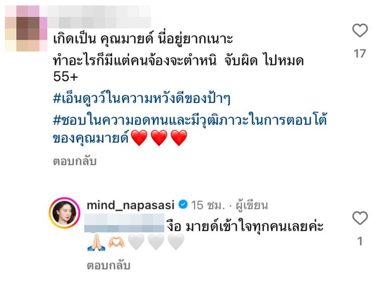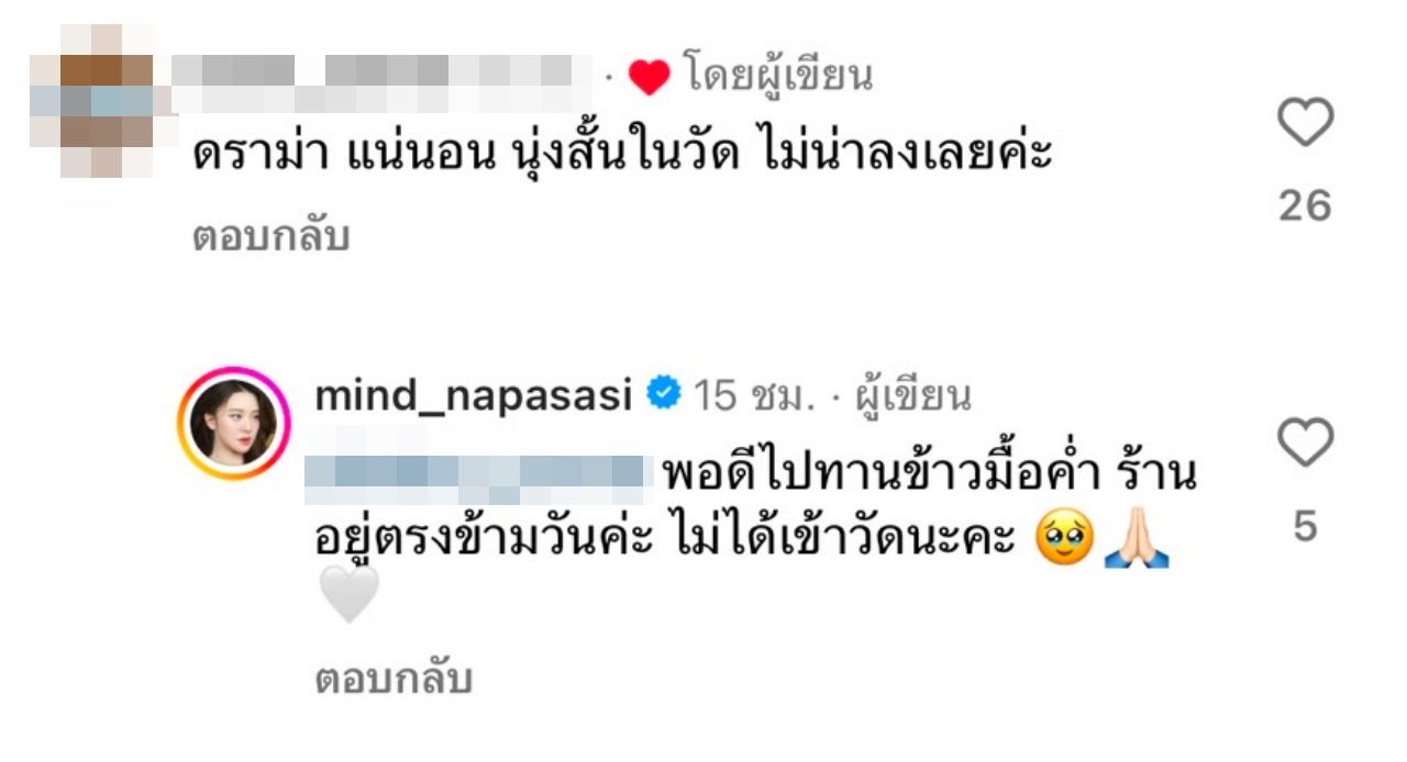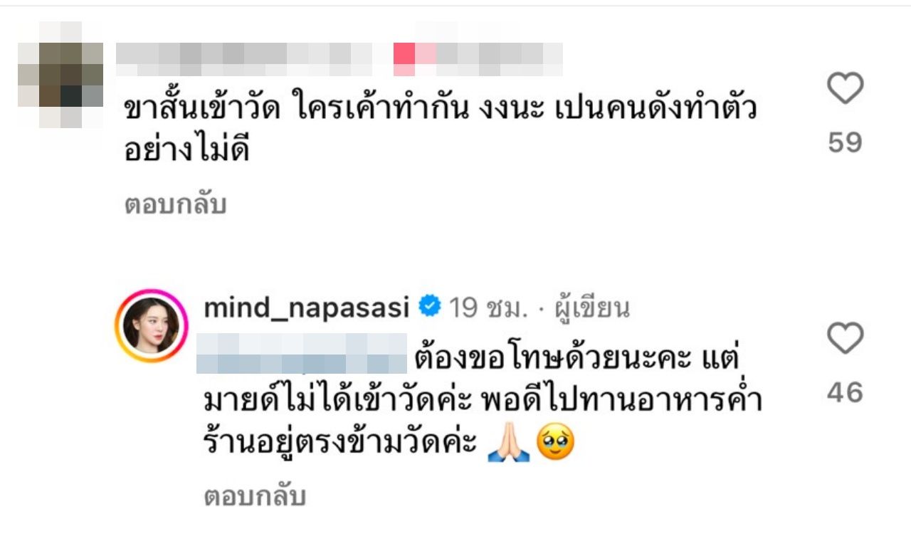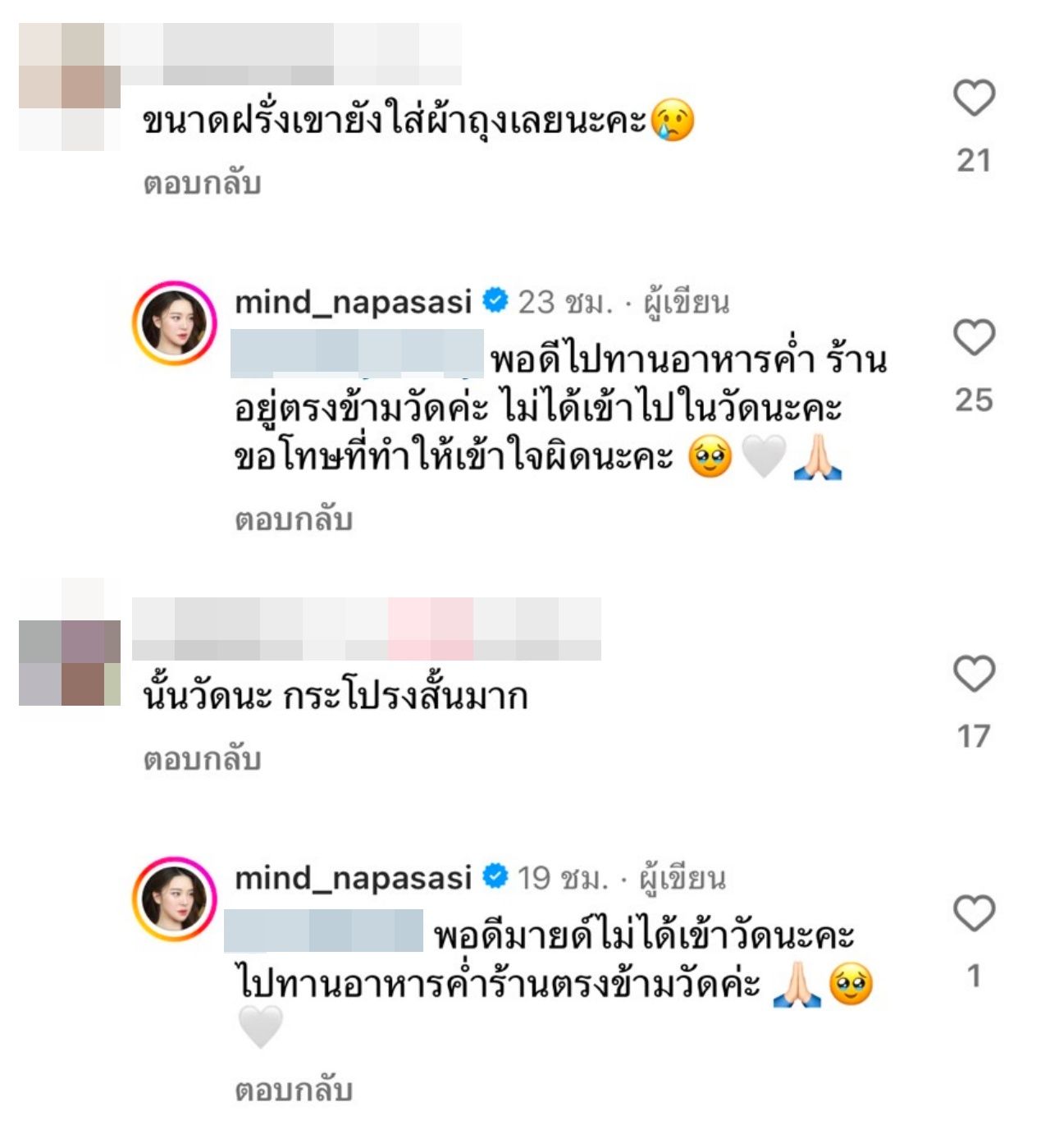 ซึ่งตัวมายด์เองก็ไม่ปล่อยผ่าน ก็ได้เข้ามาตอบกลับพร้อมอธิบายโดยบอกว่า "พอดีไปทานข้าวมื้อค่ำ ร้านอยู่ตรงข้ามวัดค่ะ ไม่ได้เข้าวัดนะคะ ขอโทษที่ทำให้เข้าใจผิดนะคะ"