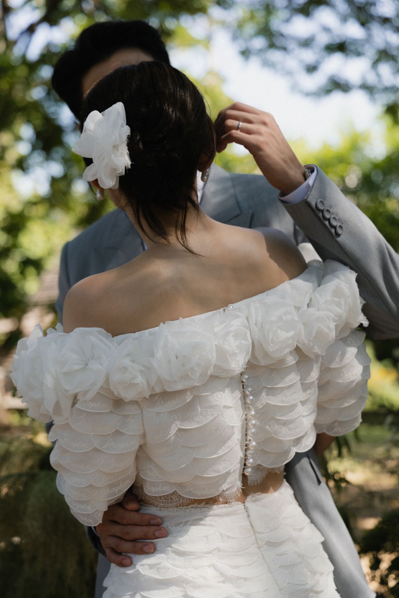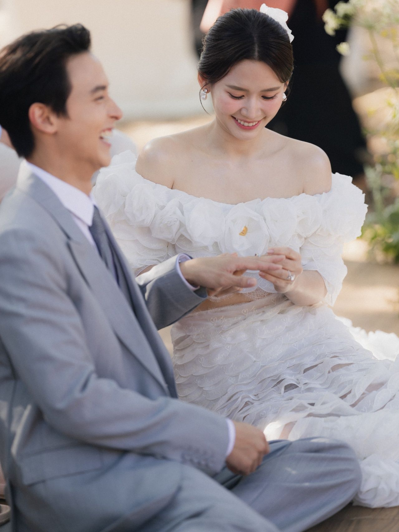 โดยมีพิธีสวมแหวนแต่งงานตามประเพณีไทย ณ ร้าน The Reise (เดอะ ไรซ์) โดยชุดแต่งงานของโฟมในช่วงเช้าวันนี้มีความพิเศษที่โฟมตั้งใจติดล็อกเก็ตที่มีรูปคุณแม่กับโฟม ซึ่งเป็นความตั้งใจพิเศษของเจ้าสาวที่อยากให้คุณแม่ได้ร่วมอยู่ในวันแห่งความสุขนี้