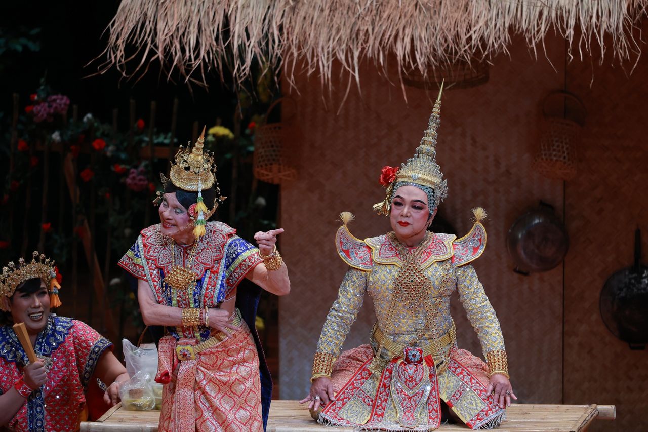 ซึ่งละครนอกจะใช้นักแสดงเป็นผู้ชายล้วน โดยมีศิลปินแห่งชาติร่วมแสดง จำนวน 3 ท่านร่วมแสดงและขับร้องเพลงคือ พ่ออี๊ด สุประวัติ ปัทมสูต ศิลปินแห่งชาติ สาขาศิลปะการแสดง ประจำปี พ.ศ. 2553 แสดงเป็นนางมณฑา นายไพฑูรย์ เข้มแข็ง ศิลปินแห่งชาติ ศิลปินแห่งชาติ สาขาศิลปะการแสดง (นาฏศิลป์ไทย - โขน ละคร) ประจำปีพุทธศักราช 2564 แสดงเป็นพระสังข์ ดร.ศุภชัย จันทร์สุวรรณ์ ศิลปินแห่งชาติ สาขาศิลปะการแสดง (นาฏศิลป์) ประจำปีพ.ศ. 2548 แสดงเป็นนางรจนา พร้อมศิลปินจากกรมศิลปากร ศิลปินรับเชิญ และนักแสดงจากชมรมนาฏศิลป์และดนตรีไทย ในมูลนิธืสมาคมสตรีอุดมศึกษาฯ