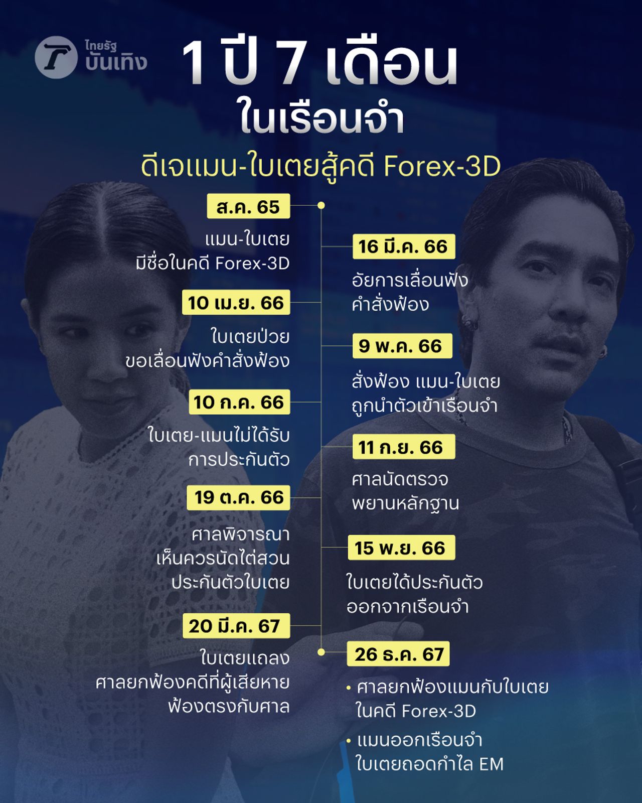 วันนี้ บันเทิงไทยรัฐออนไลน์ จะขอย้อนไทม์ไลน์ของ ใบเตย อาร์สยาม และ ดีเจแมน ตั้งแต่เริ่มต้นที่มีชื่อเข้าไปพัวพันกับคดี Forex-3D ถูกคุมตัวเข้าเรือนจำ จนถึงวันที่ได้รับการปล่อยตัวของทั้งคู่