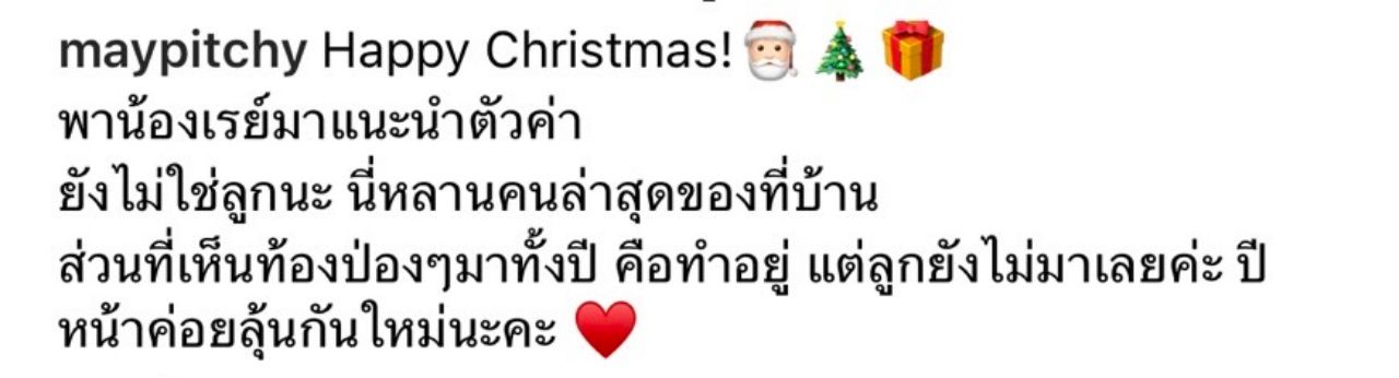"Happy Christmas! พาน้องเรย์มาแนะนำตัวค่า ยังไม่ใช่ลูกนะ นี่หลานคนล่าสุดของที่บ้าน ส่วนที่เห็นท้องป่องๆ มาทั้งปี คือทำอยู่ แต่ลูกยังไม่มาเลยค่ะ ปีหน้าค่อยลุ้นกันใหม่นะคะ"