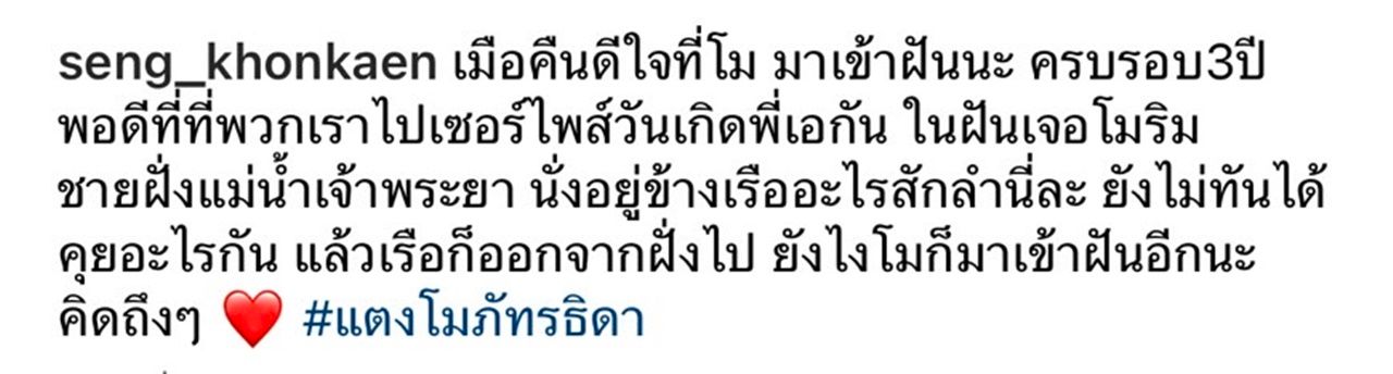 "เมื่อคืนดีใจที่โมมาเข้าฝันนะ ครบรอบ 3 ปีพอดีที่พวกเราไปเซอร์ไพรส์วันเกิดพี่เอกัน ในฝันเจอโมริมชายฝั่งแม่น้ำเจ้าพระยา นั่งอยู่ข้างเรืออะไรสักลำนี่แหละ ยังไม่ทันได้คุยอะไรกัน แล้วเรือก็ออกจากฝั่งไป ยังไงโมก็มาเข้าฝันอีกนะ คิดถึงๆ #แตงโมภัทรธิดา"