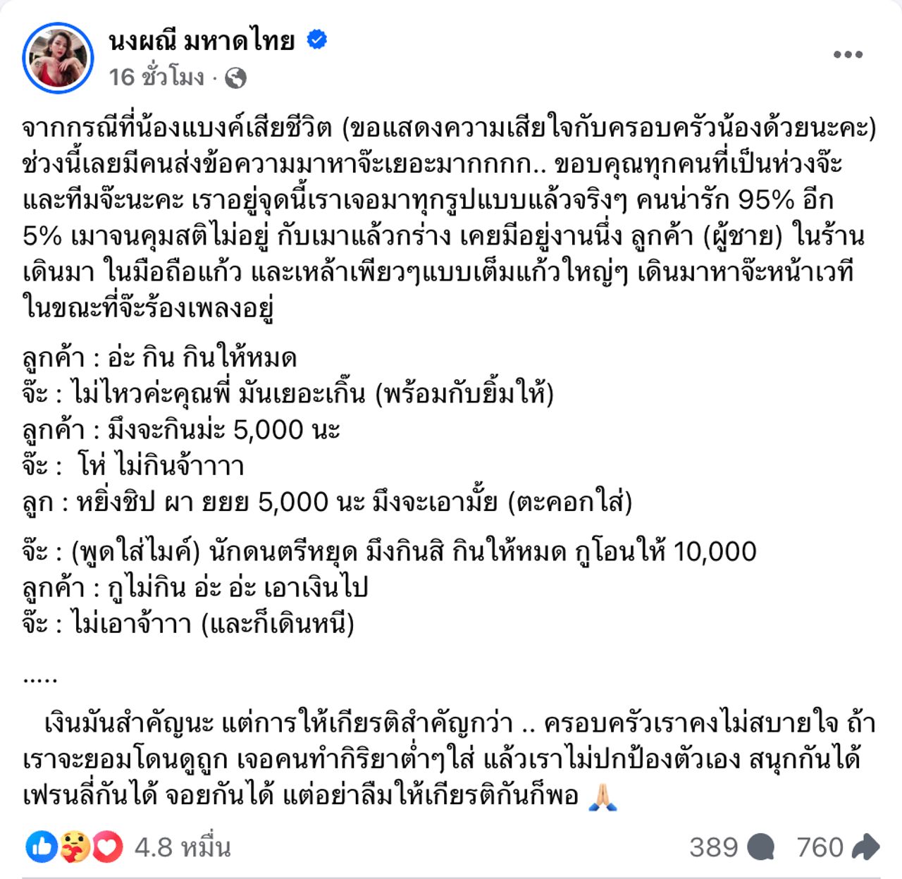 "จากกรณีที่น้องแบงค์เสียชีวิต (ขอแสดงความเสียใจกับครอบครัวน้องด้วยนะคะ) ช่วงนี้เลยมีคนส่งข้อความมาหาจ๊ะเยอะมากกกก.. ขอบคุณทุกคนที่เป็นห่วงจ๊ะ และทีมจ๊ะนะคะ เราอยู่จุดนี้เราเจอมาทุกรูปแบบแล้วจริงๆ