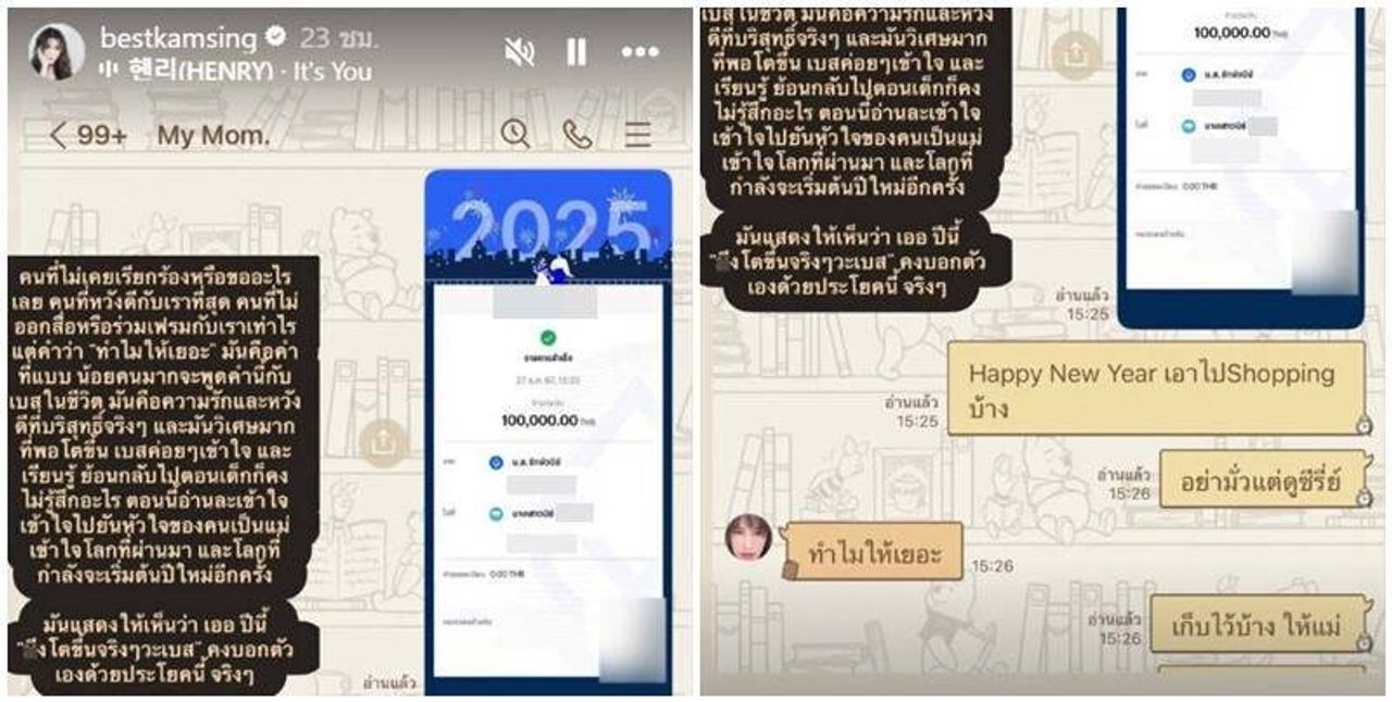 ล่าสุดเบสท์ได้ลงภาพในสตอรี่ไอจี เป็นรูปสลิปที่โอนเงินให้ แม่อ้อย เสาวนีย์ เอาไปช้อปปิ้งในวันปีใหม่ พร้อมแชทข้อความที่พิมพ์คุยตอบโต้กันของ 2 แม่ลูกว่า “Happy New Year เอาไปช้อปปิ้งบ้าง อย่ามัวแต่ดูซีรีส์” ในขณะที่แม่อ้อยถามกลับว่า “ทำไมให้เยอะ” ซึ่งเบสท์ตอบไปว่า “เก็บไว้บ้าง ให้แม่”