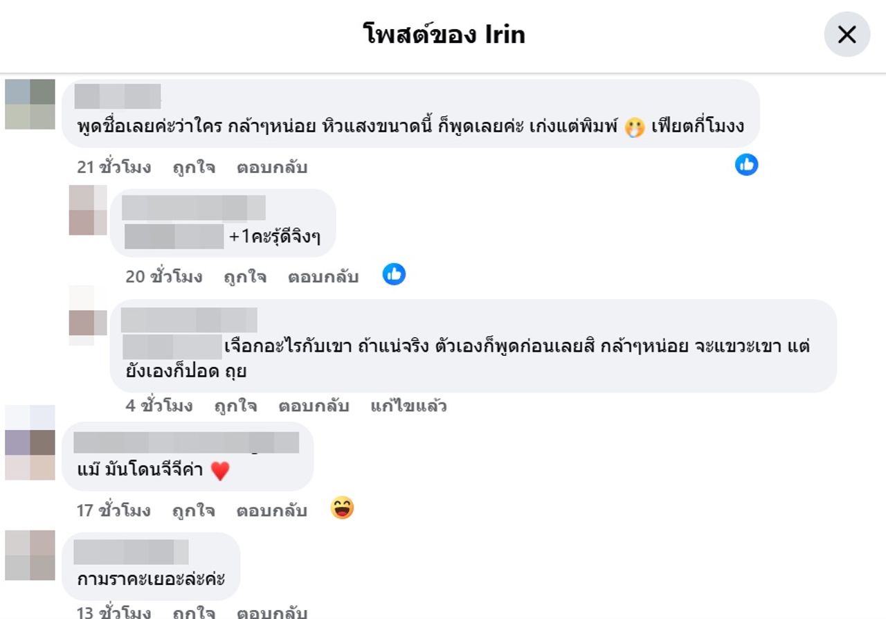 โดย เปิ้ล ไอริณ โพสต์ข้อความว่า “ฟาดสื่อไม่ให้เกียรติ!! แล้วเวลาอยู่กับสามีชาวบ้าน ที่เค้าพึ่งครอบครัวแตกแยก ได้สำรวม และให้เกียรติเพศแม่ด้วยกันไหม??