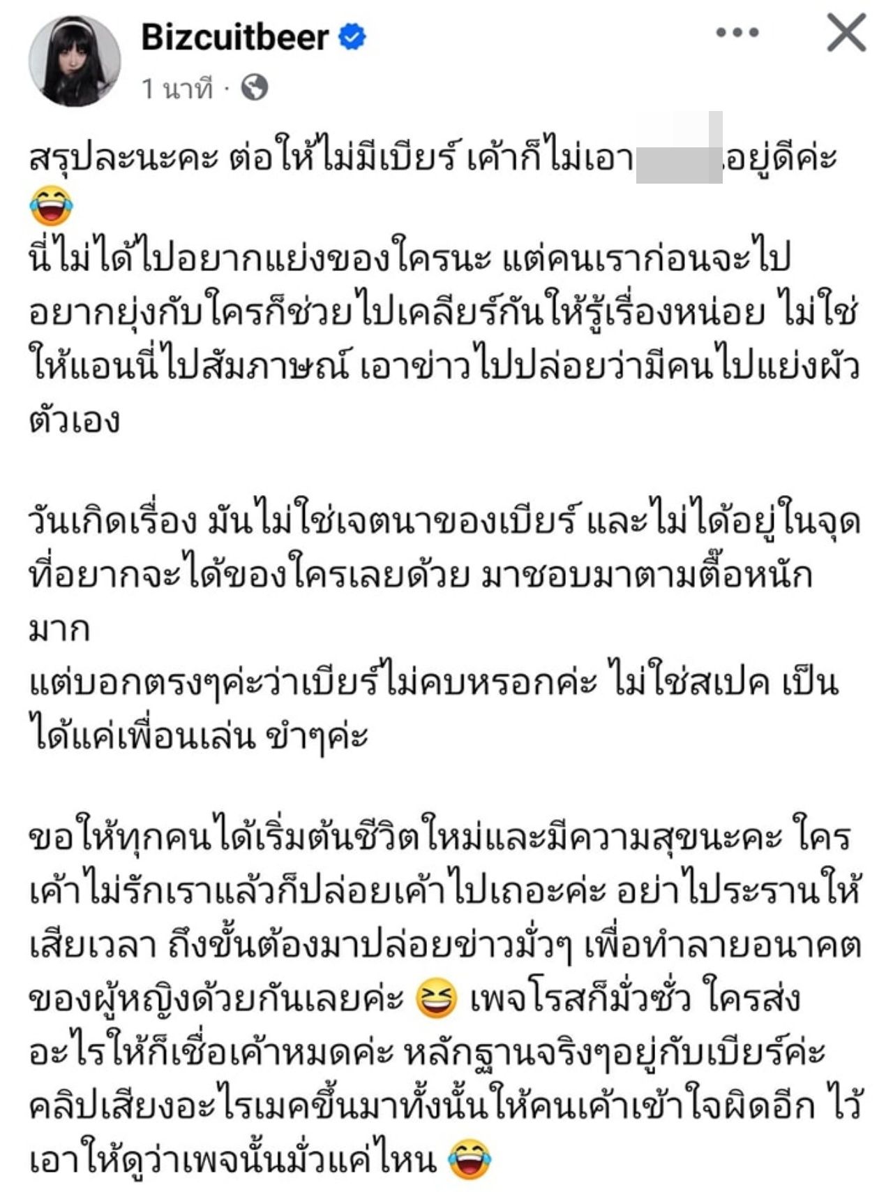ขอให้ทุกคนได้เริ่มต้นชีวิตใหม่และมีความสุขนะคะ ใครเขาไม่รักเราแล้วก็ปล่อยเขาไปเถอะค่ะ อย่าไประรานให้เสียเวลา ถึงขั้นต้องมาปล่อยข่าวมั่วๆ เพื่อทำลายอนาคตของผู้หญิงด้วยกันเลยค่ะ เพจโรสก็มั่วซั่ว ใครส่งอะไรให้ก็เชื่อเขาหมดค่ะ หลักฐานจริงๆ อยู่กับเบียร์ค่ะ คลิปเสียงอะไรเมกขึ้นมาทั้งนั้นให้คนเขาเข้าใจผิดอีก ไว้เอาให้ดูว่าเพจนั้นมั่วแค่ไหน"