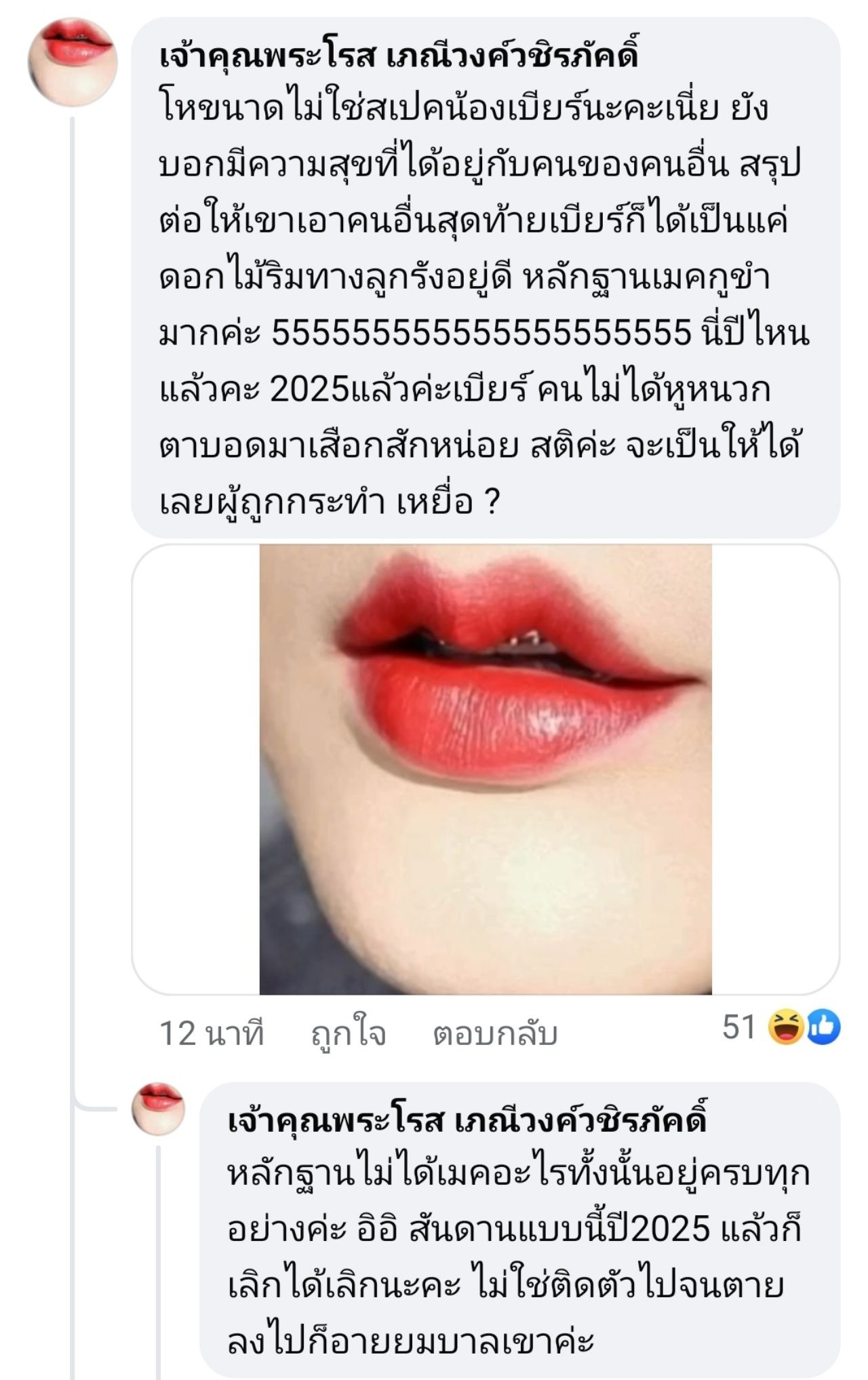 จากนั้นเพจคู่กรณีของ เบียร์ ก็ได้เข้ามาตอบกลับทันทีว่า "โห ขนาดไม่ใช่สเปกน้องเบียร์นะคะเนี่ย ยังบอกมี ความสุขที่ได้อยู่กับคนของคนอื่น สรุปต่อให้เขา เอาคนอื่นสุดท้ายเบียร์ก็ได้เป็นแค่ดอกไม้ริมทาง ลูกรังอยู่ดี หลักฐานเมกกูขำมากค่ะ 555555555555555555555 นี่ปีไหนแล้วคะ 2025 แล้วค่ะเบียร์ คนไม่ได้หูหนวกตาบอดมาเสือกสักหน่อย สติค่ะ จะเป็นให้ได้เลยผู้ถูก กระทำ เหยื่อ ?" และ "หลักฐานไม่ได้เมกอะไรทั้งนั้นอยู่ครบทุกอย่างค่ะ อิอิ สันดานแบบนี้ปี 2025 แล้วก็เลิกได้เลิกนะคะ ไม่ใช่ติดตัวไปจนตาย ลงไปก็อายยมบาลเขาค่ะ"