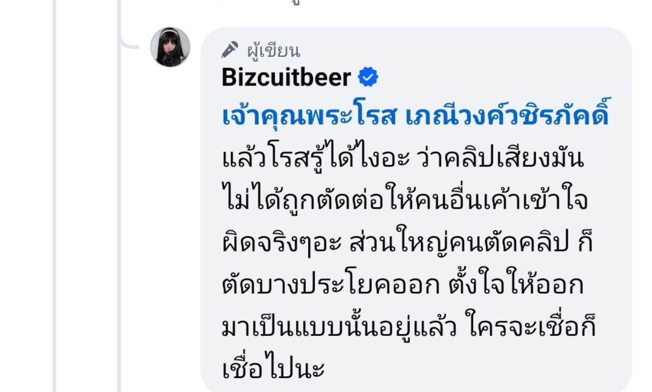 และ เบียร์ ก็ได้เข้ามาตอบกลับว่า "โรสรู้ได้ไงอะ ว่าคลิปเสียงมันไม่ได้ถูกตัดต่อให้คนอื่นเค้าเข้าใจผิดจริง ๆ อะ ส่วนใหญ่คนตัดคลิป ก็ตัดบางประโยคออก ตั้งใจให้ออกมาเป็นแบบนั้นอยู่แล้ว ใครจะเชื่อก็เชื่อไปนะ"